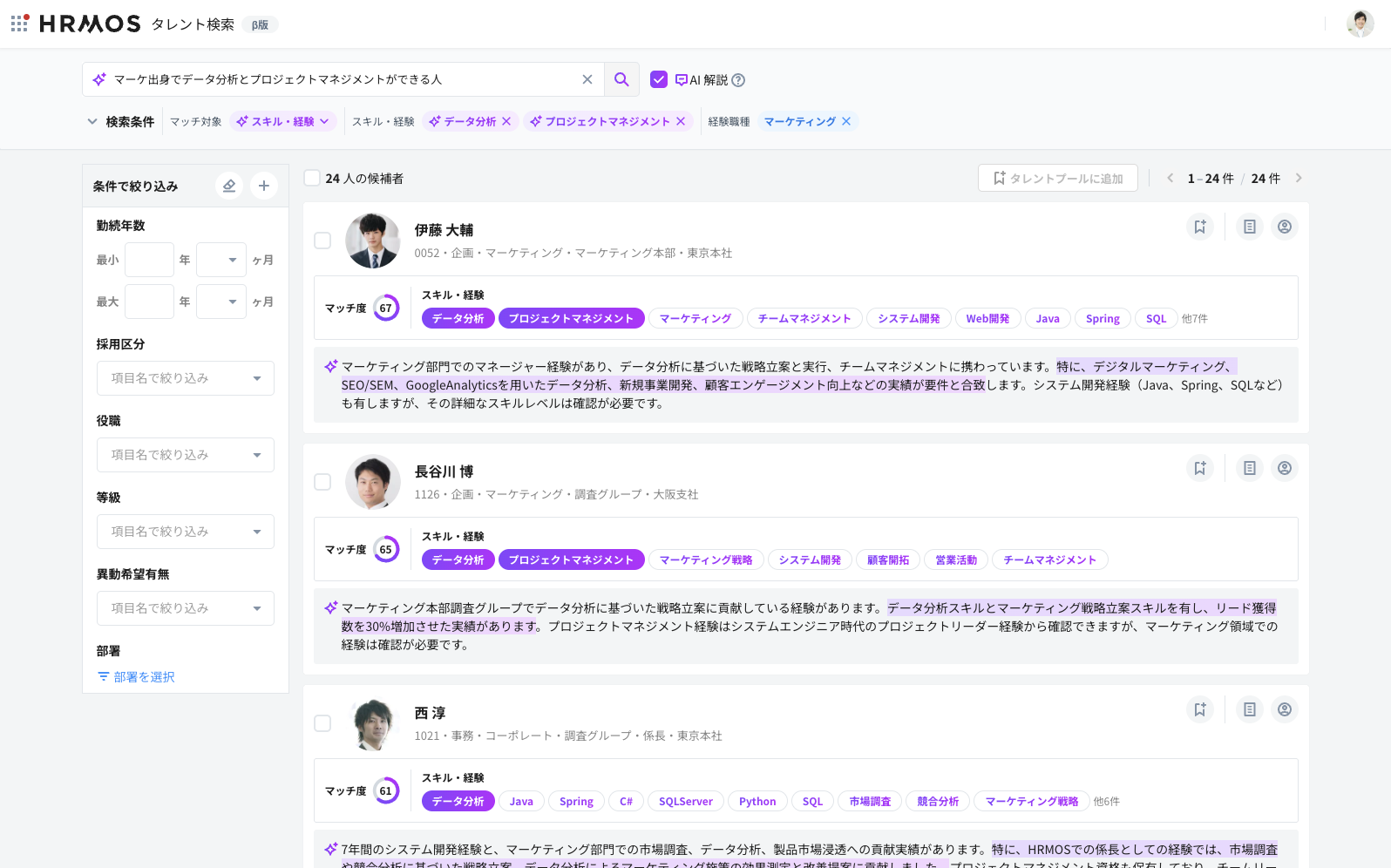 スキルや資格名などのキーワードが完全に一致しなくても、AIが意味の近さを判定し、関連性の高い候補者をマッチ度順に表示します。