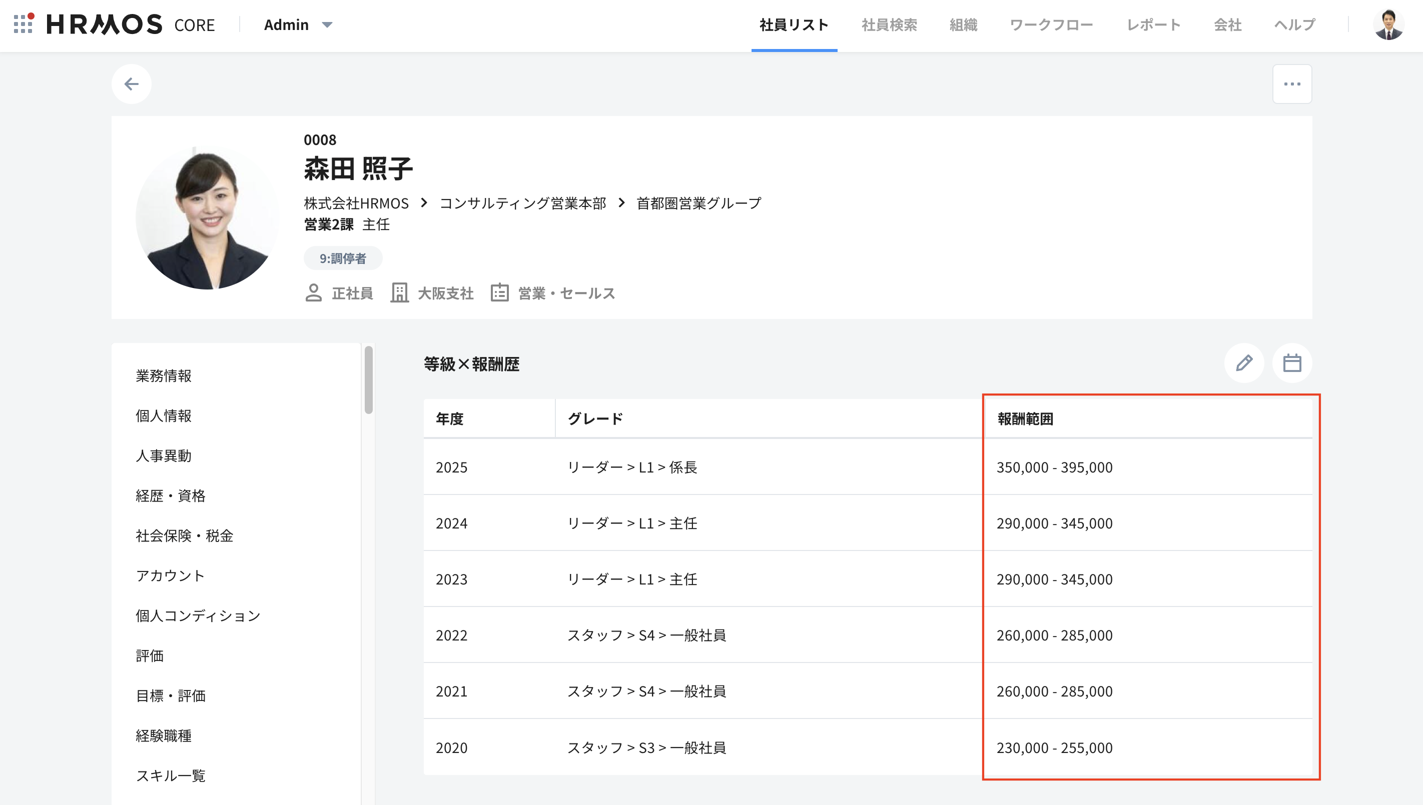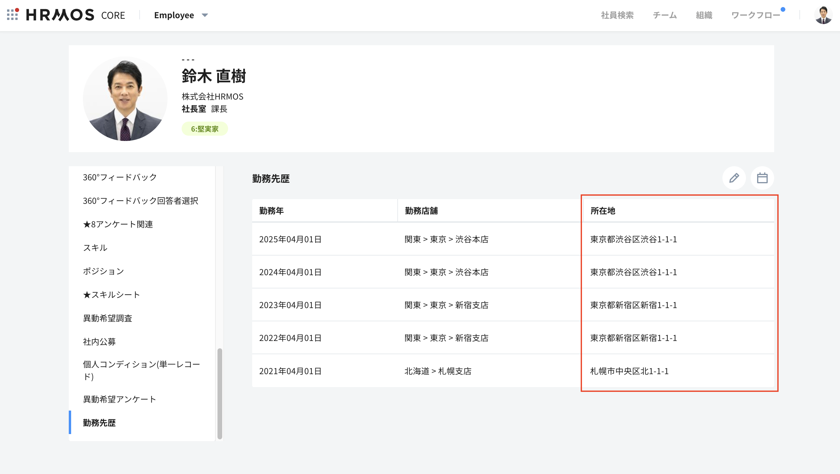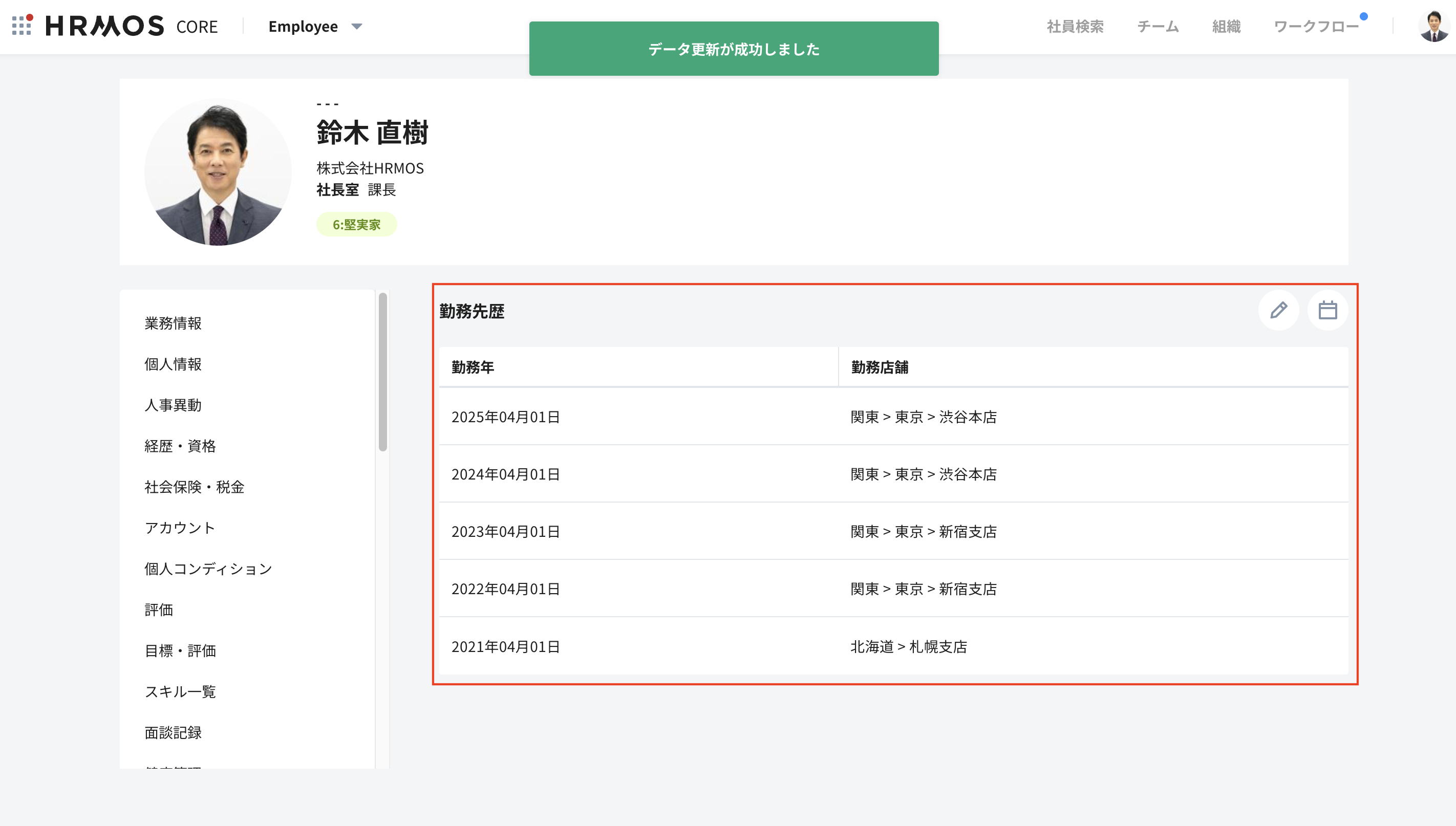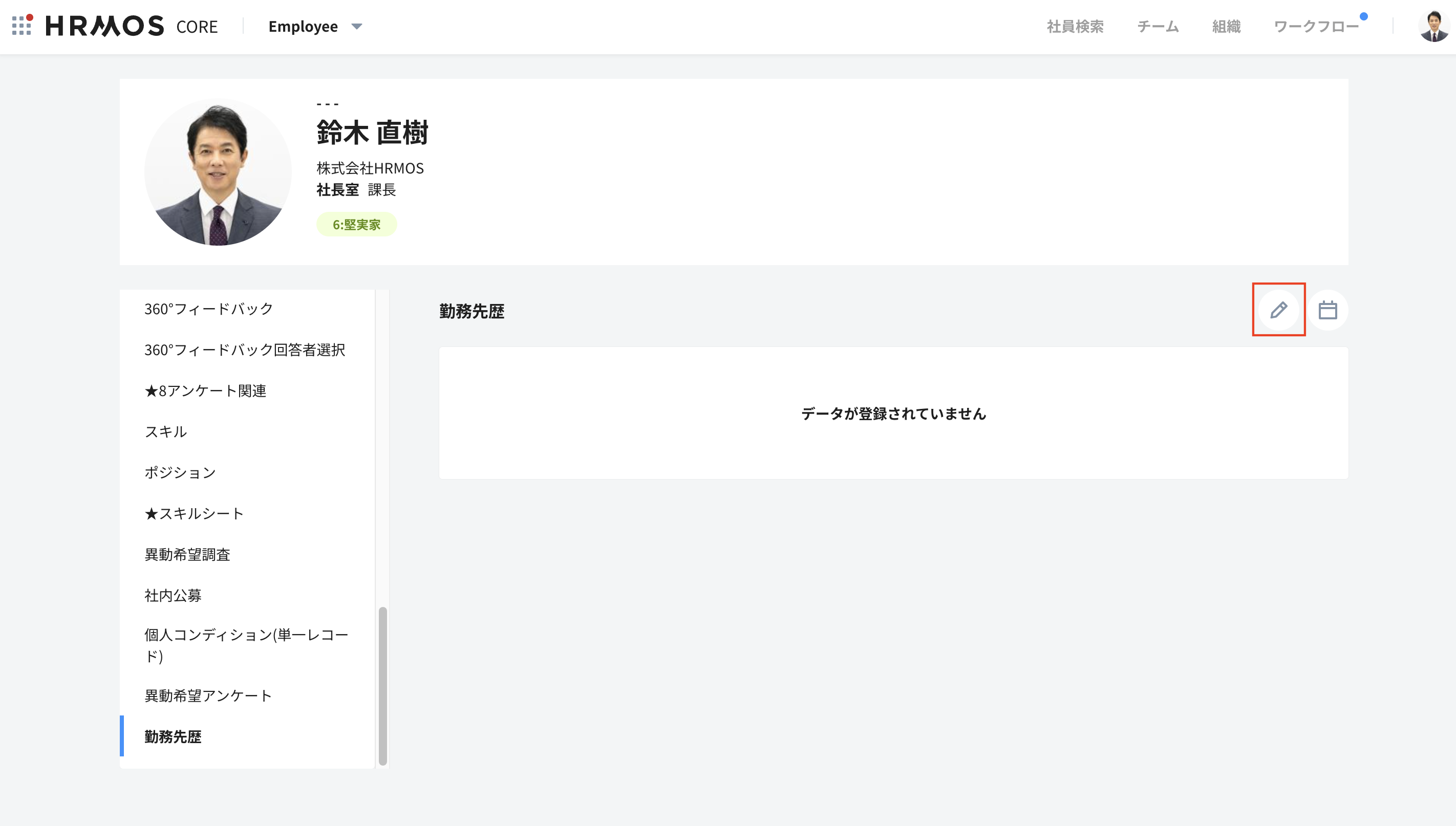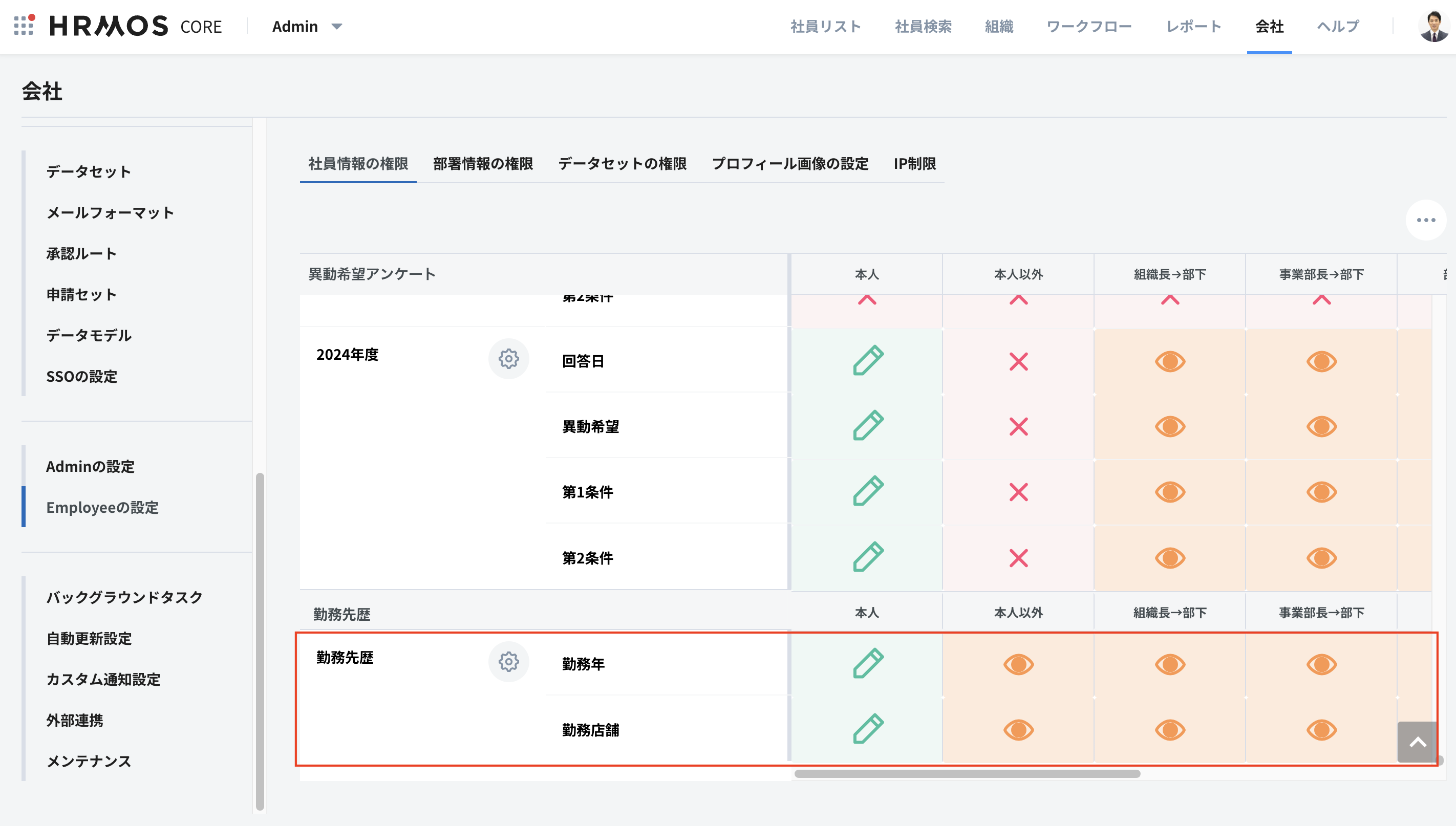 続いて、「勤務先歴」の登録が行えるよう、社員情報の権限設定を行います。