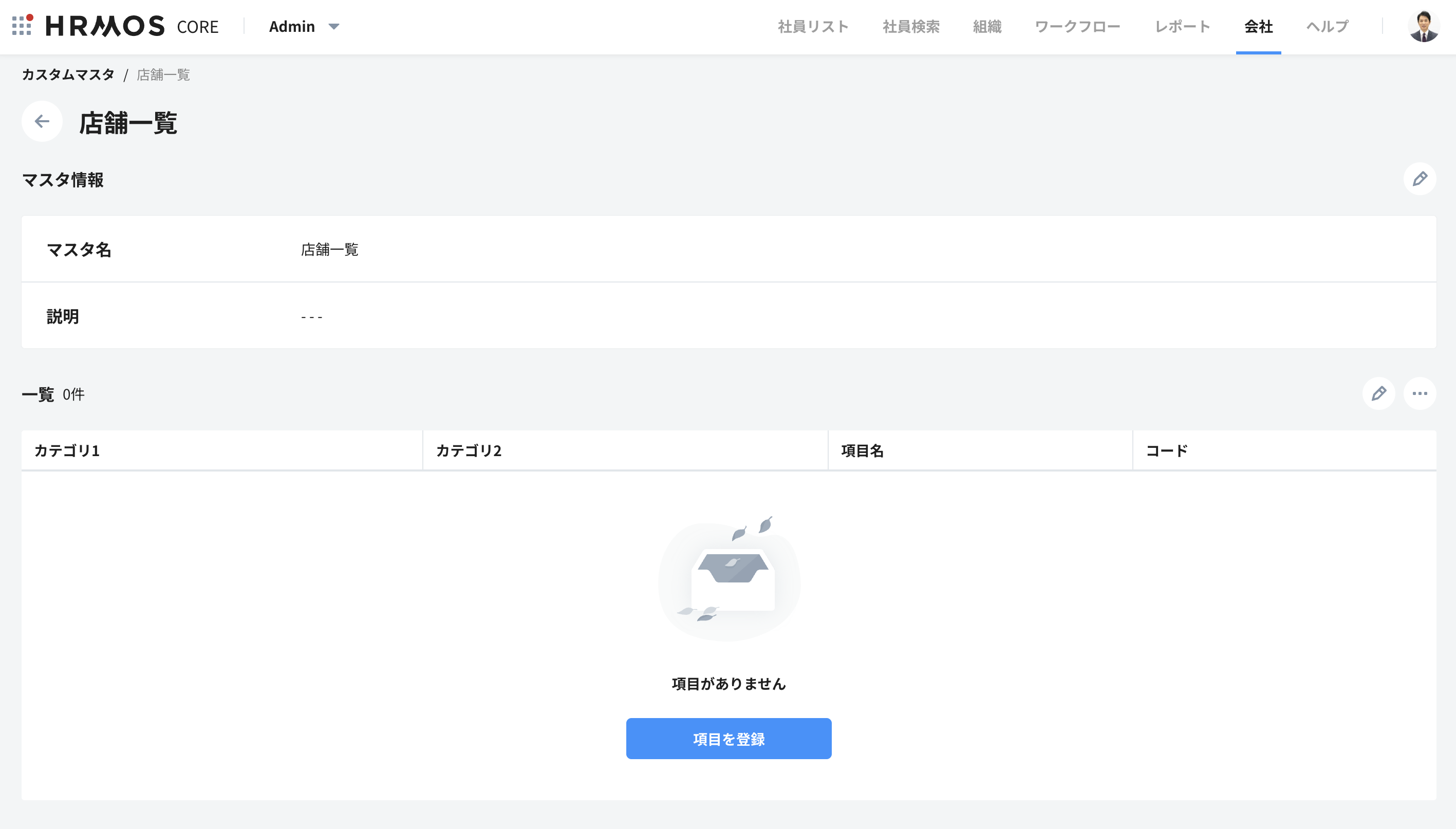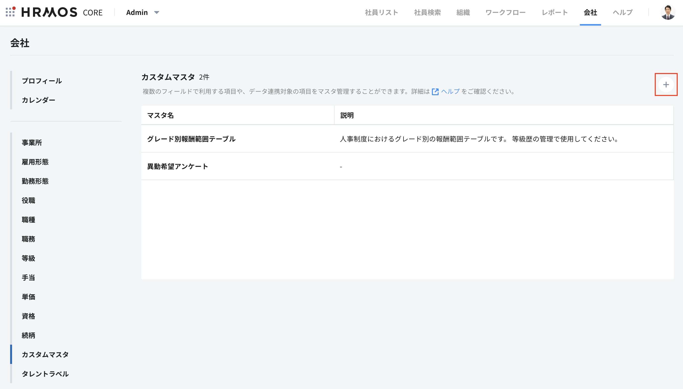 Admin(管理画面) > 会社タブ > 「カスタムマスタ」を選択します。
