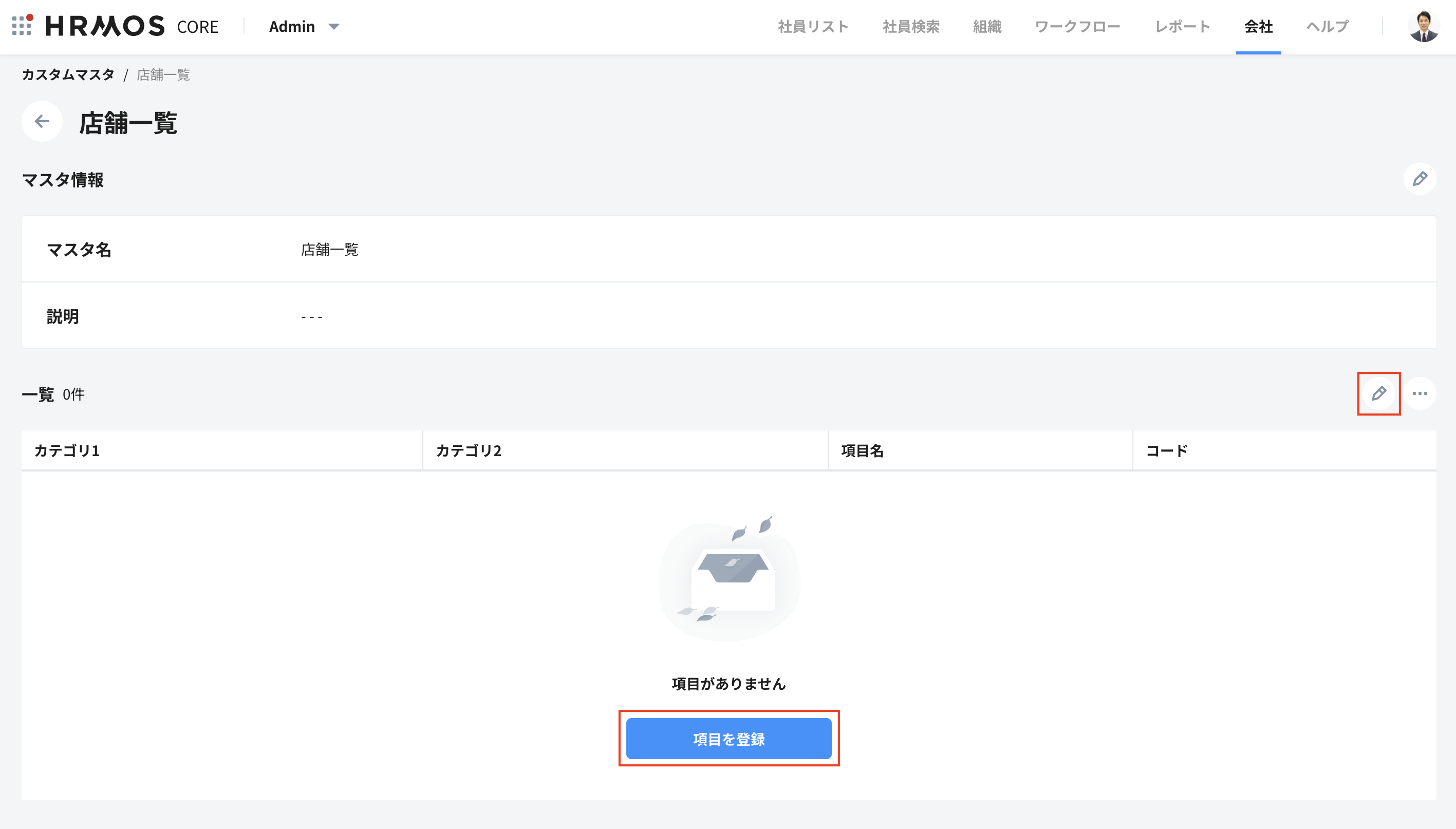 画面右上の編集ボタン または 「項目を登録」ボタンから、マスタ項目を登録します。