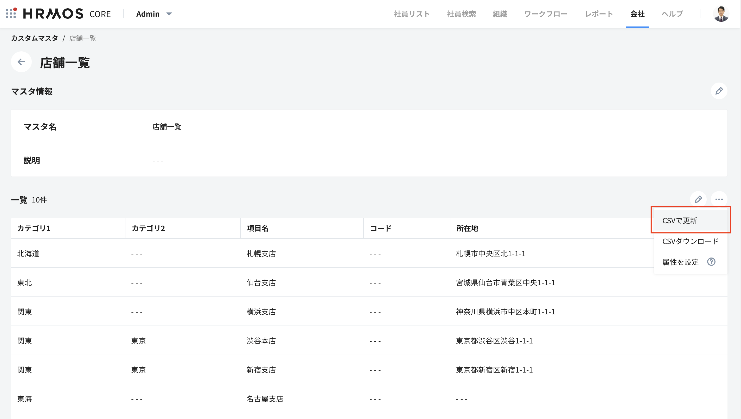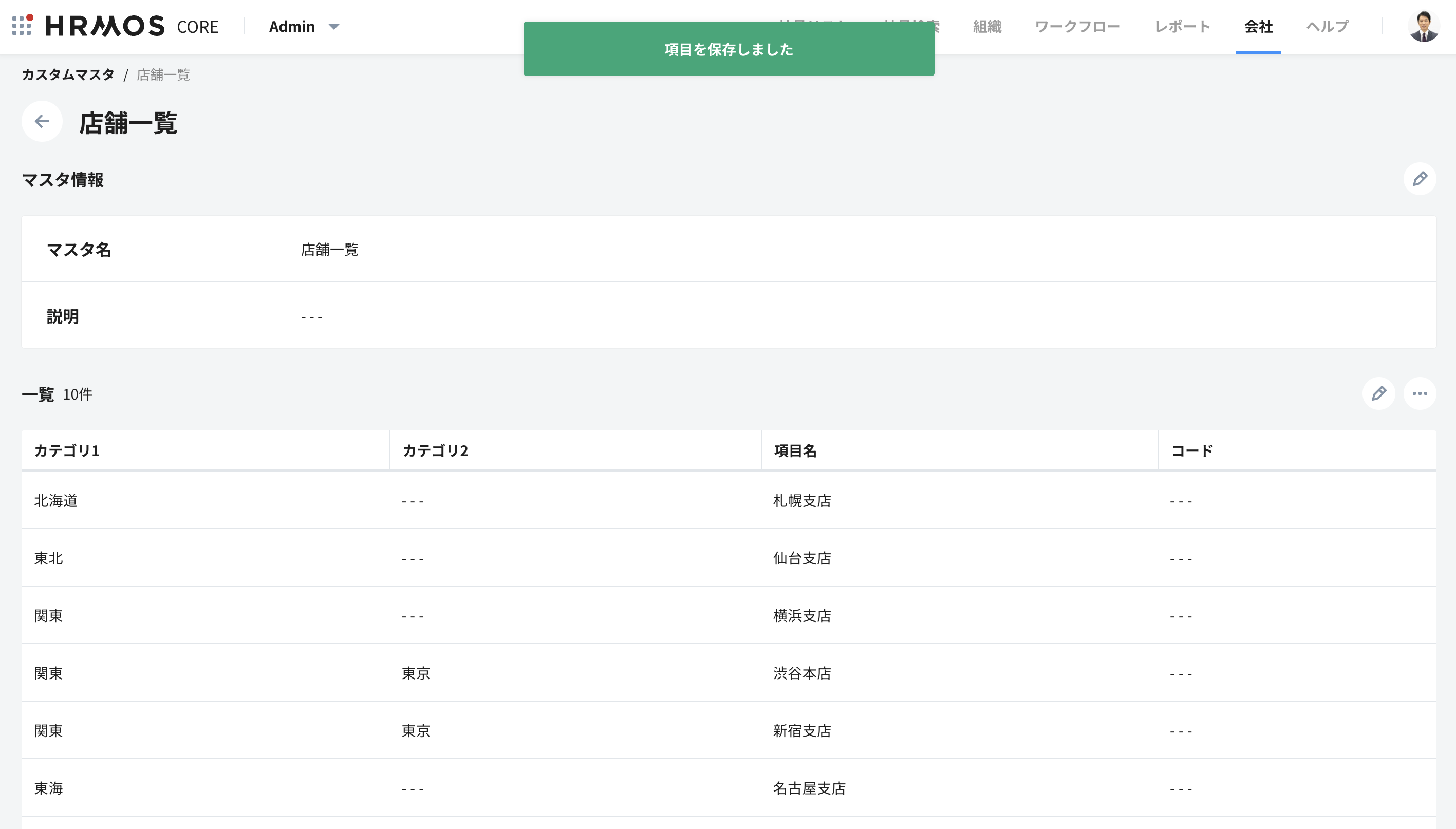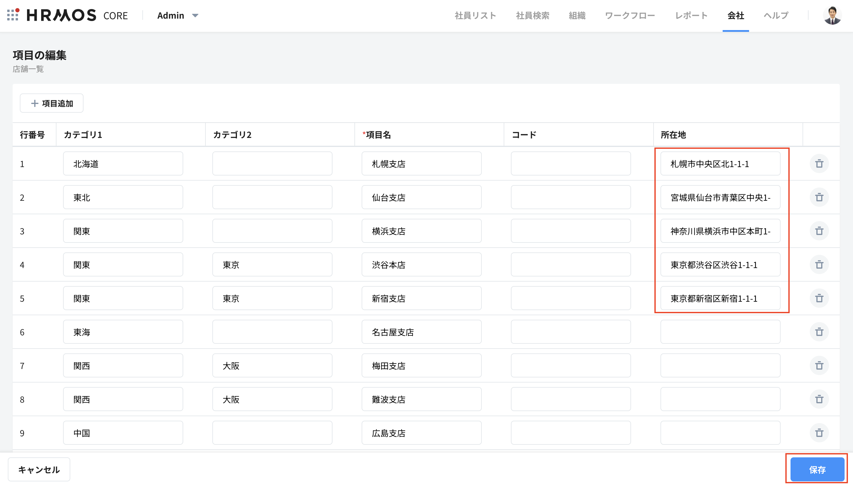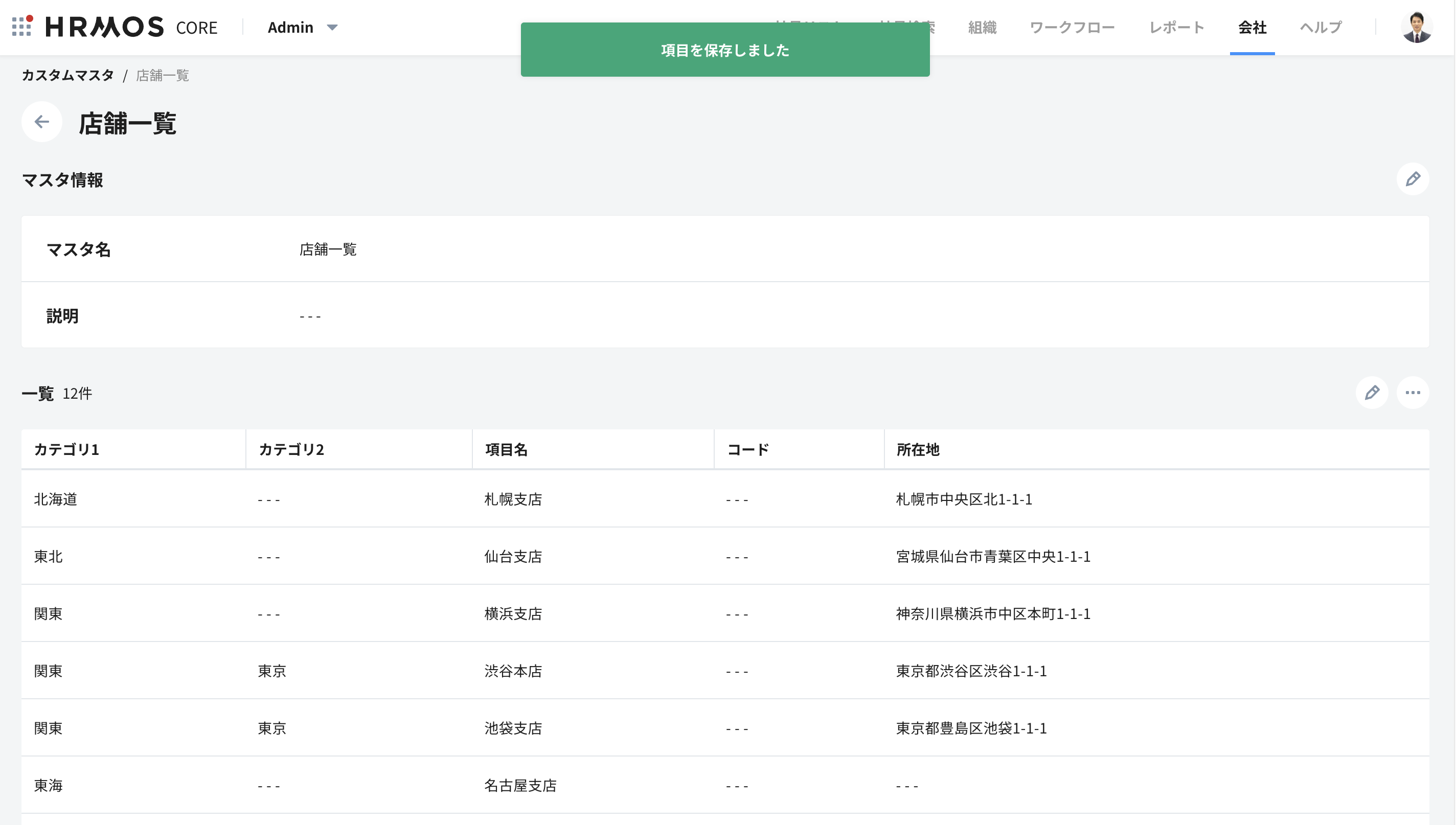 「店舗一覧」マスタで設定したマスタ項目に紐づく「所在地」が登録されていることを確認できます。