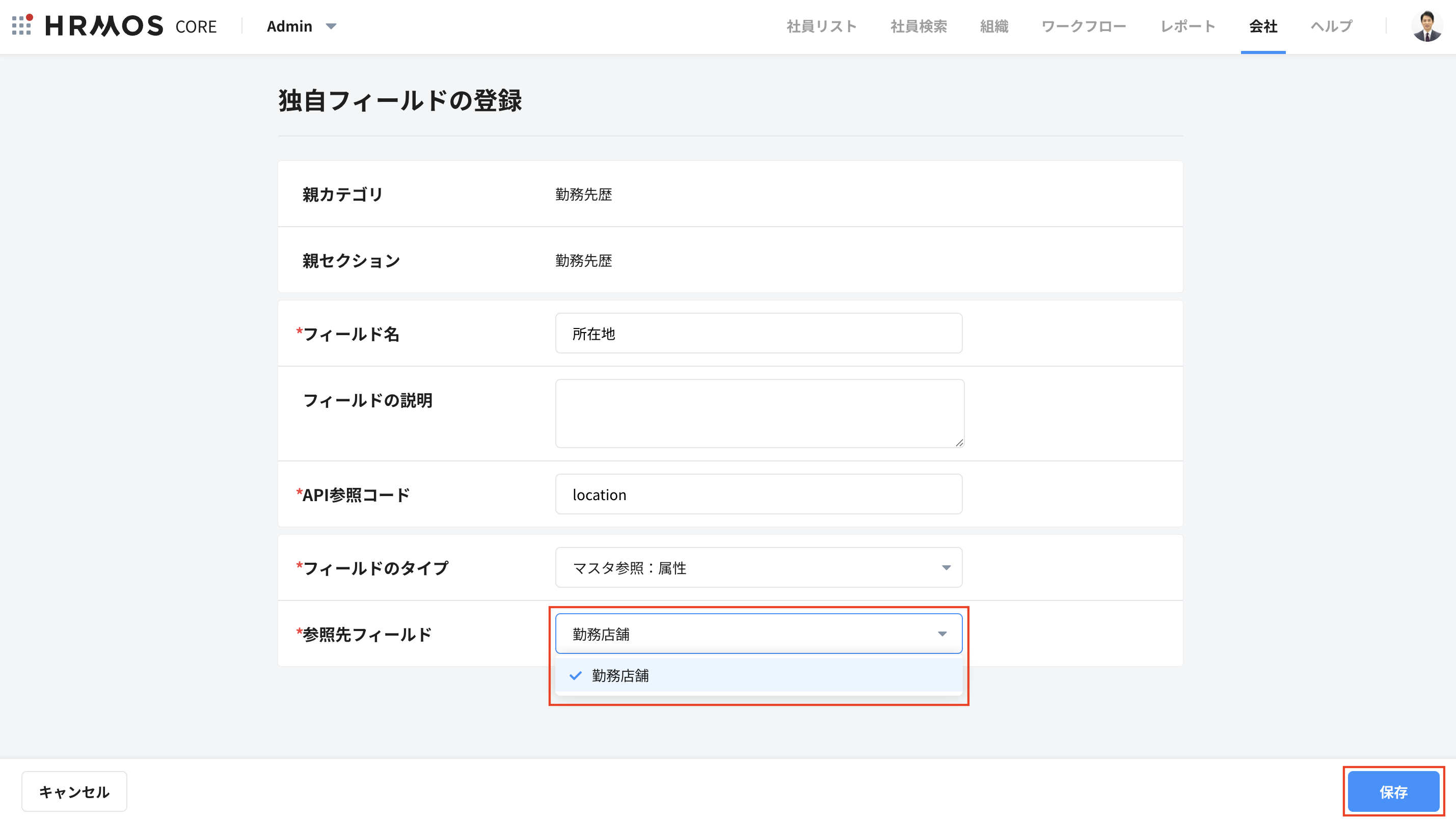 「勤務店舗」フィールドで、「店舗一覧」マスタを参照するように設定します。