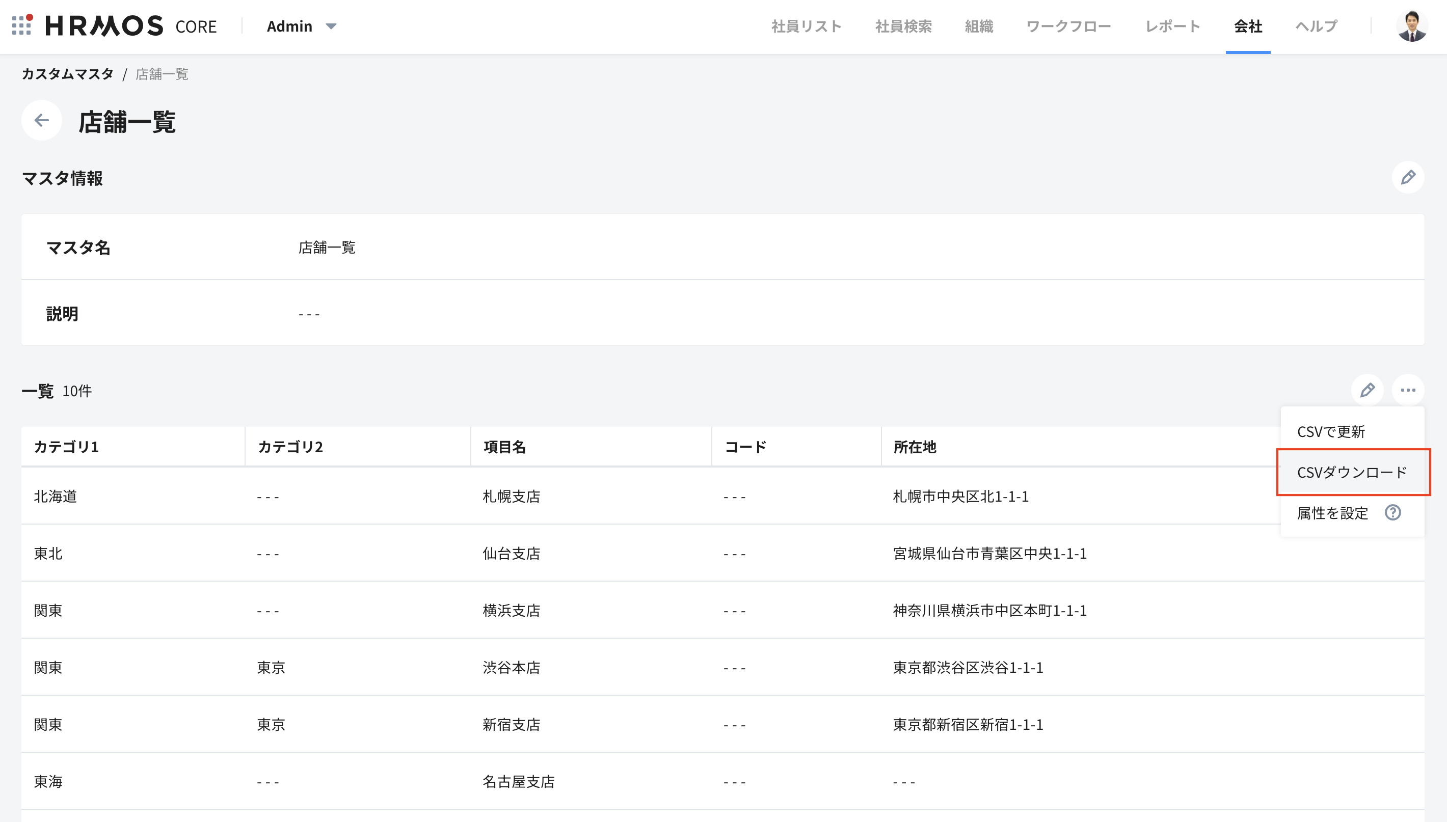 マスタ詳細画面 > 三点メニュー > 「CSVダウンロード」を選択します。