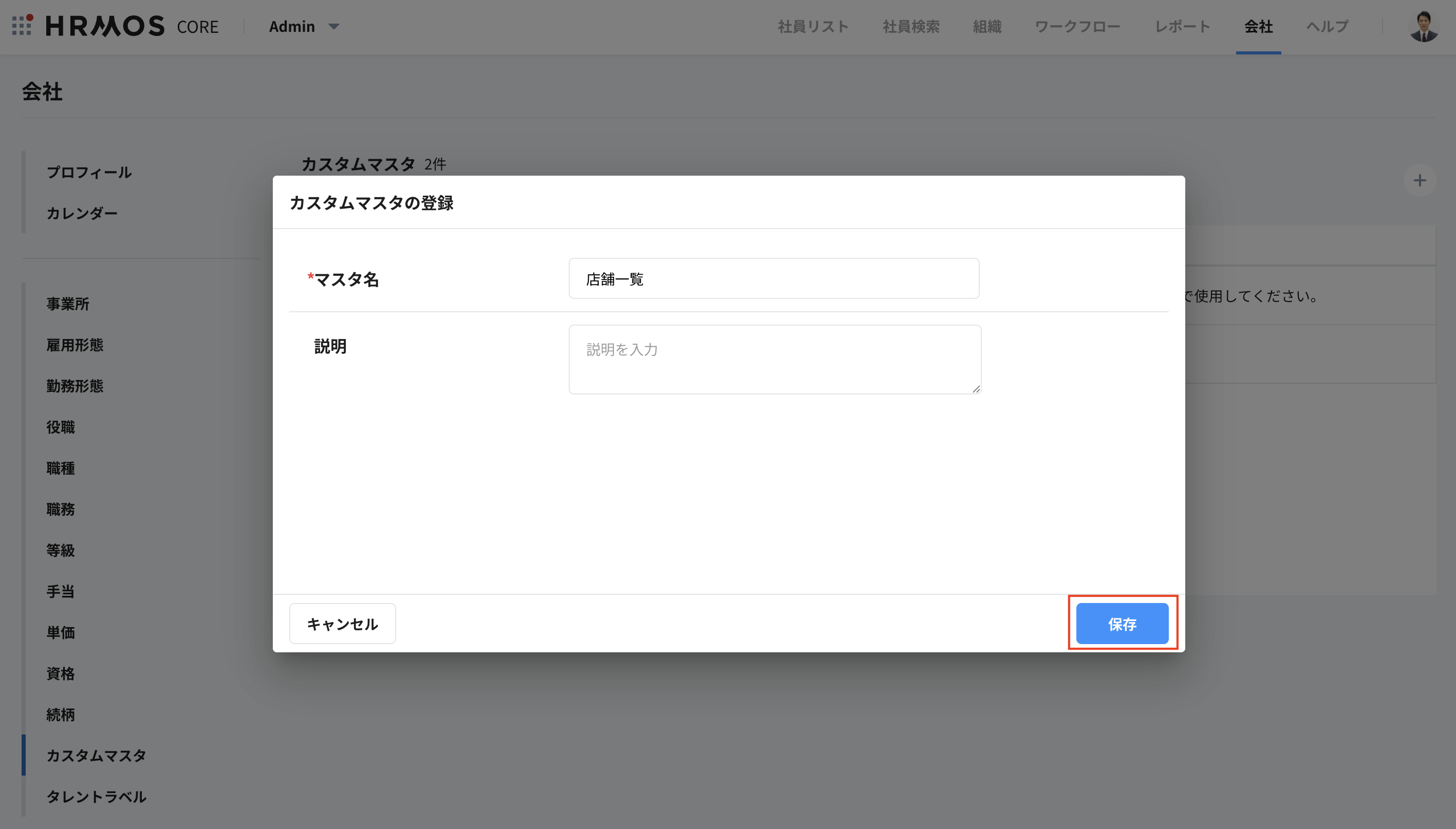 マスタ名(必須)と説明文(任意)を入力し、「保存」を選択します。