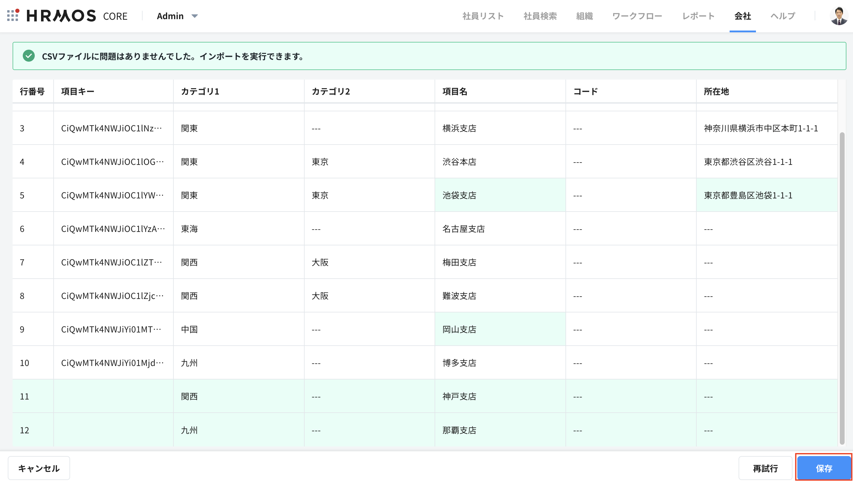 エラーが出た場合は、エラー内容をご確認のうえCSVファイルを修正し、「再試行」からリトライしてください。