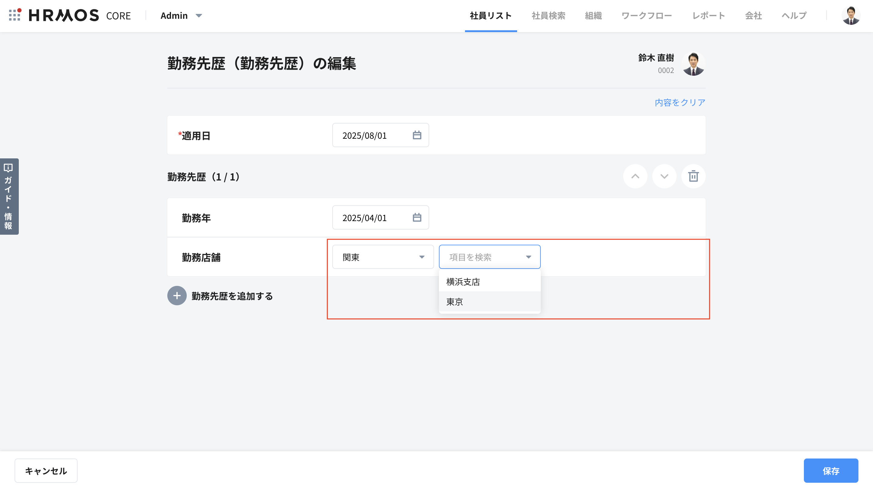 「勤務店舗」の選択肢で、「店舗一覧」マスタの項目から選択することができます。