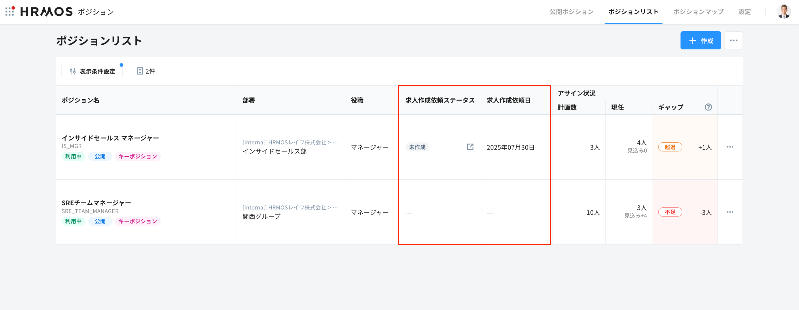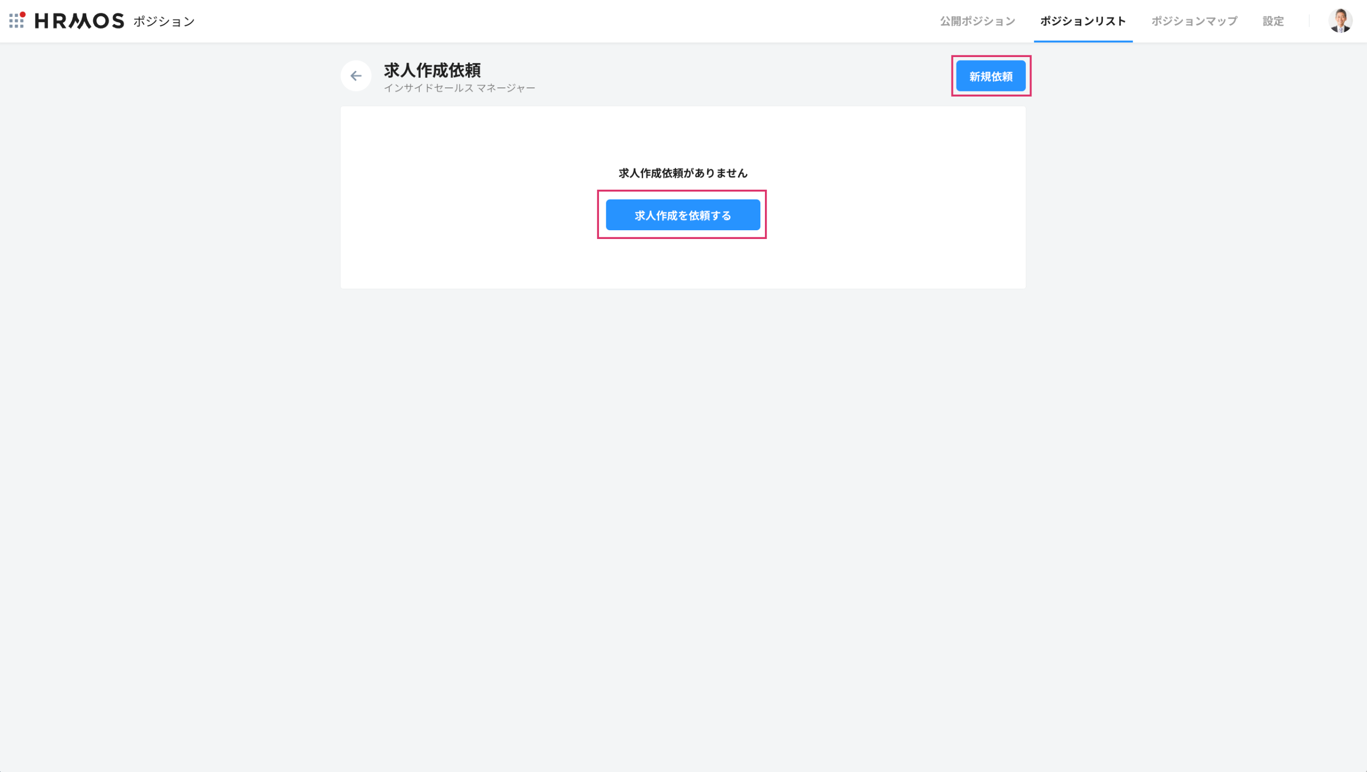 ※ 利用中のポジションのみ、「求人作成依頼」のボタンが有効になります。