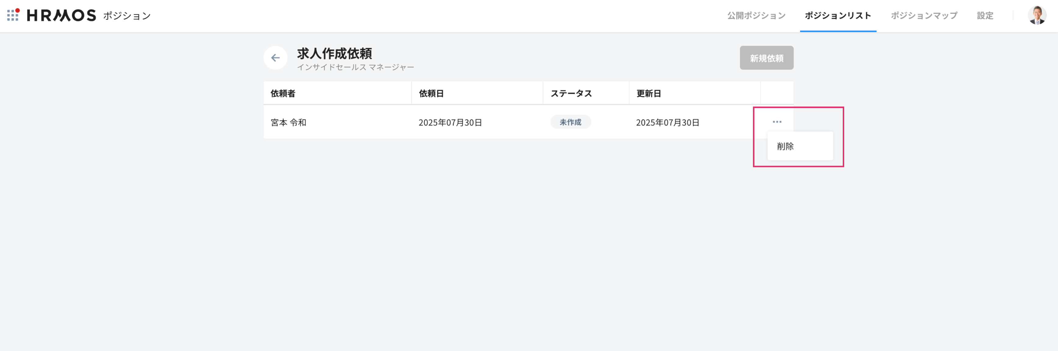1. 該当ポジションの求人作成依頼一覧>該当の依頼>三点リーダー>削除する