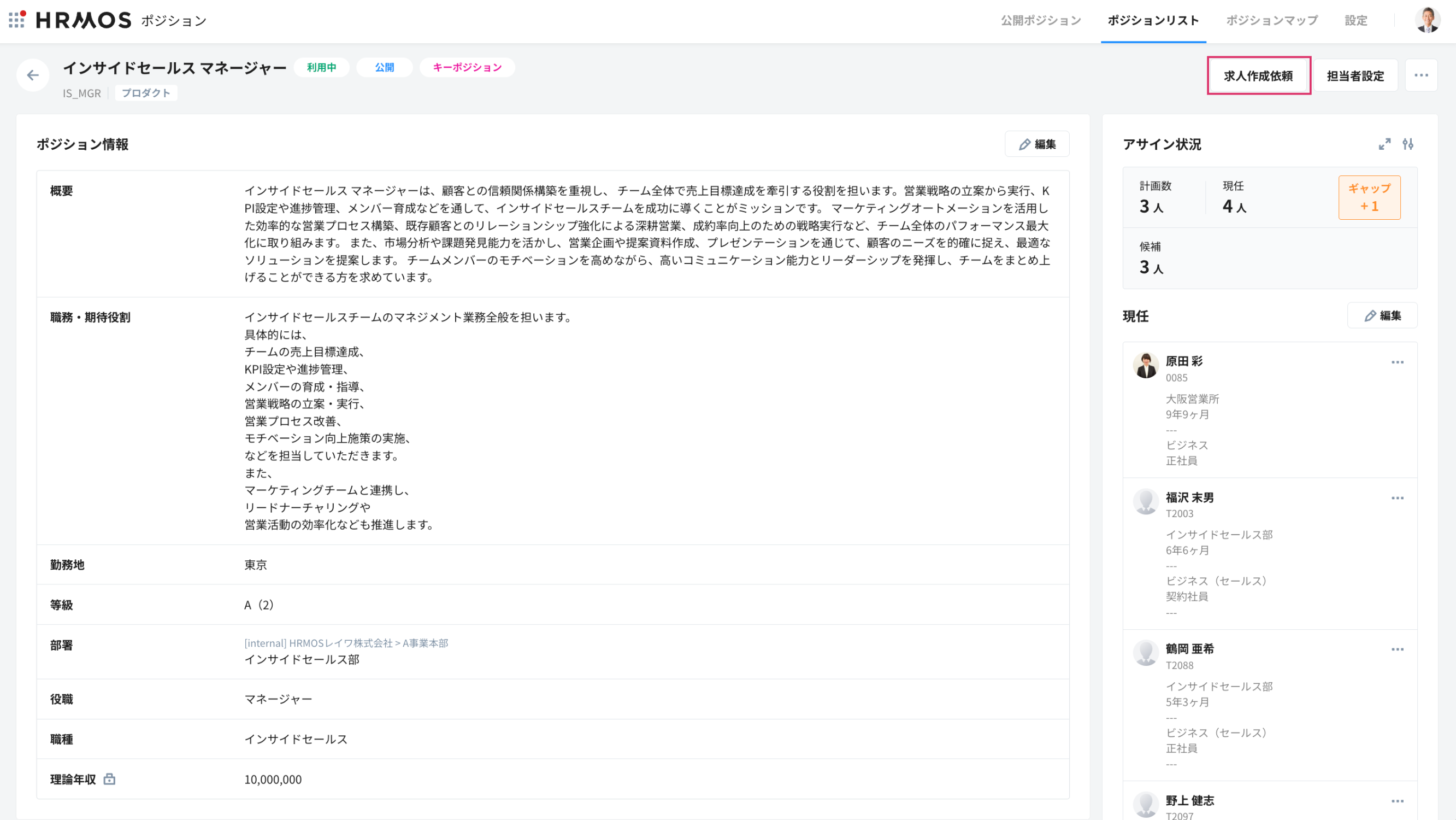1. 「ポジション詳細ページ」>「求人作成依頼」をクリックします。