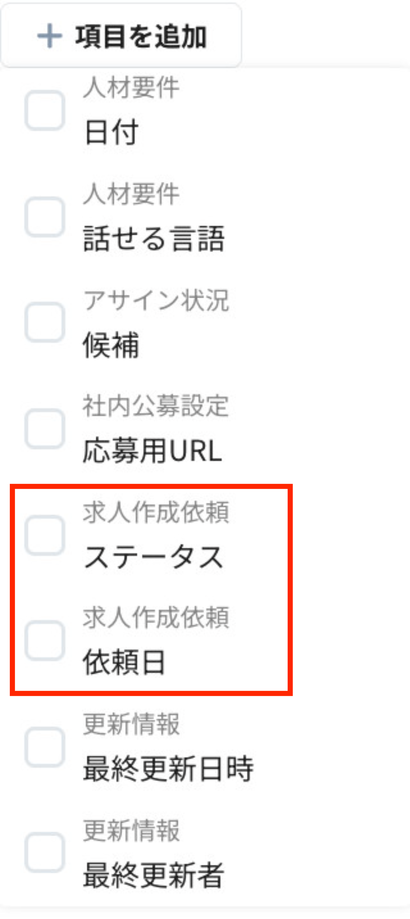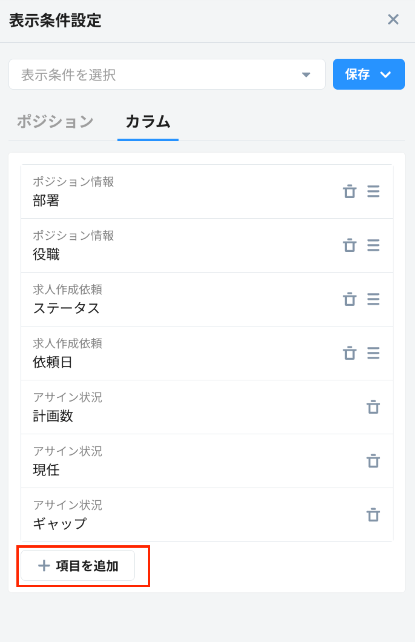 1. 表示条件設定 > カラム リストに「求人作成依頼 > ステータス」と「求人作成依頼 > 依頼日」 を追加します。