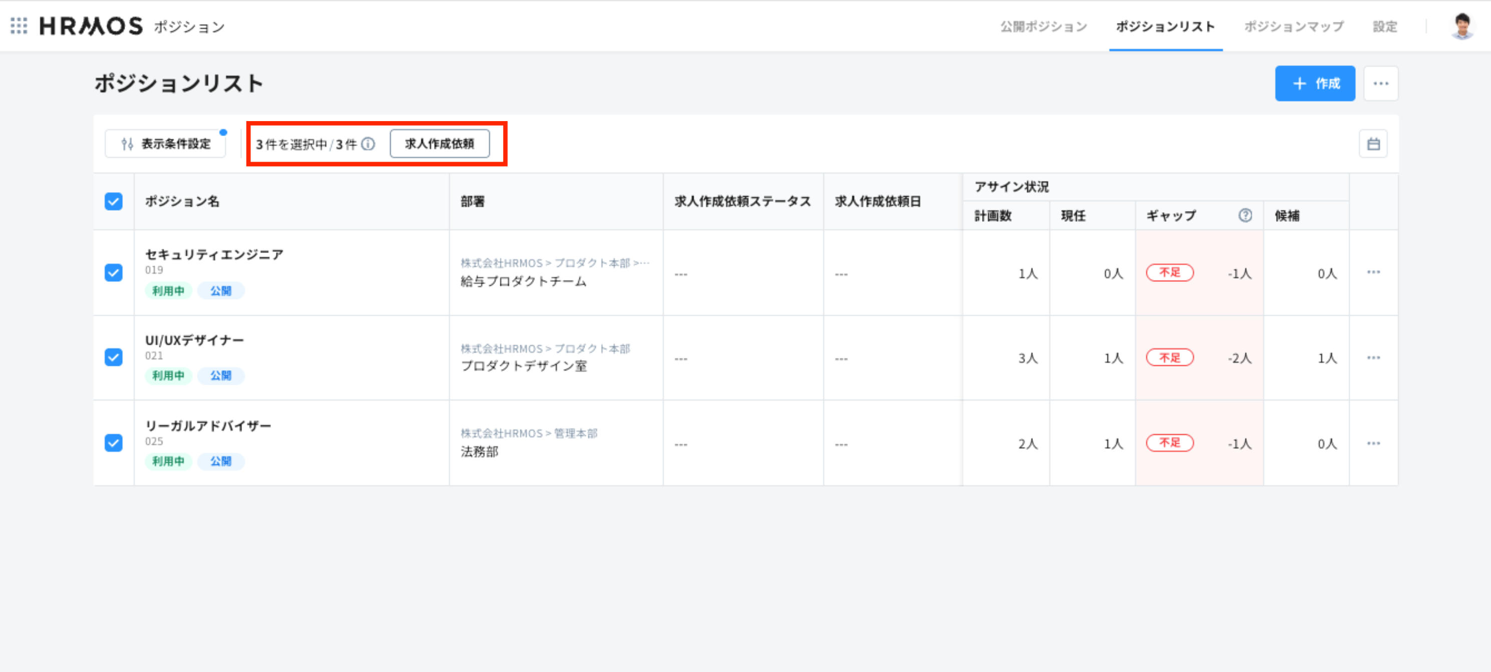 3. 選択済みのポジションについて、求人作成を依頼できるかどうかがシステムで判定されます。