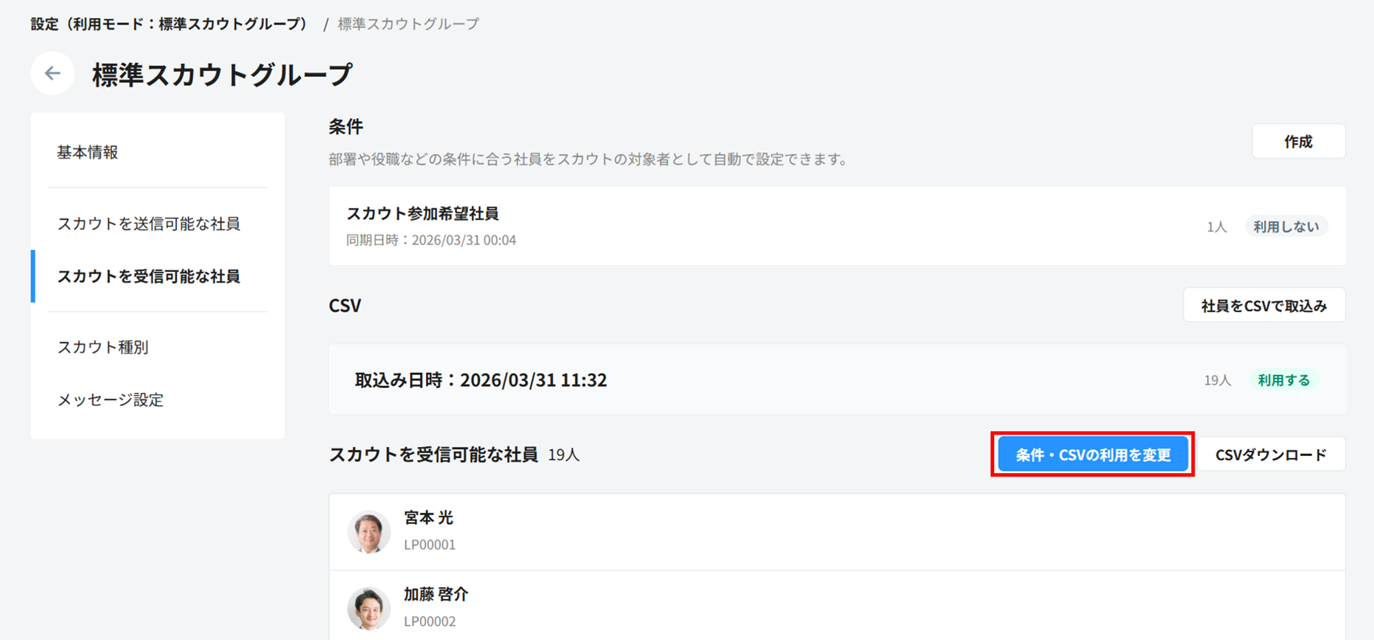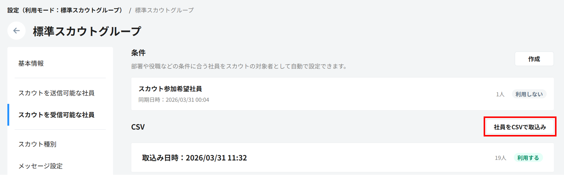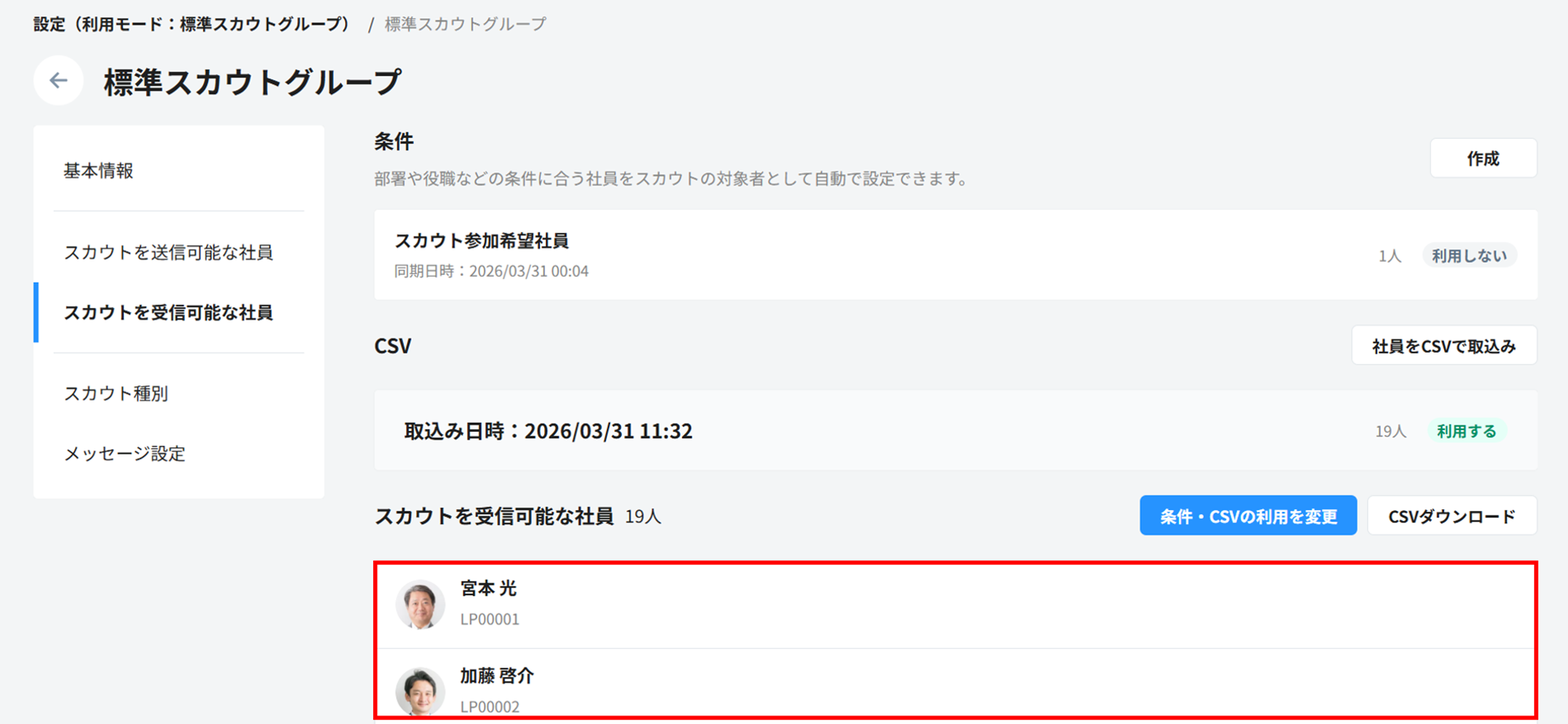 スカウトを受信可能な社員の登録方法は、CSVと条件指定の2パターンがあります。