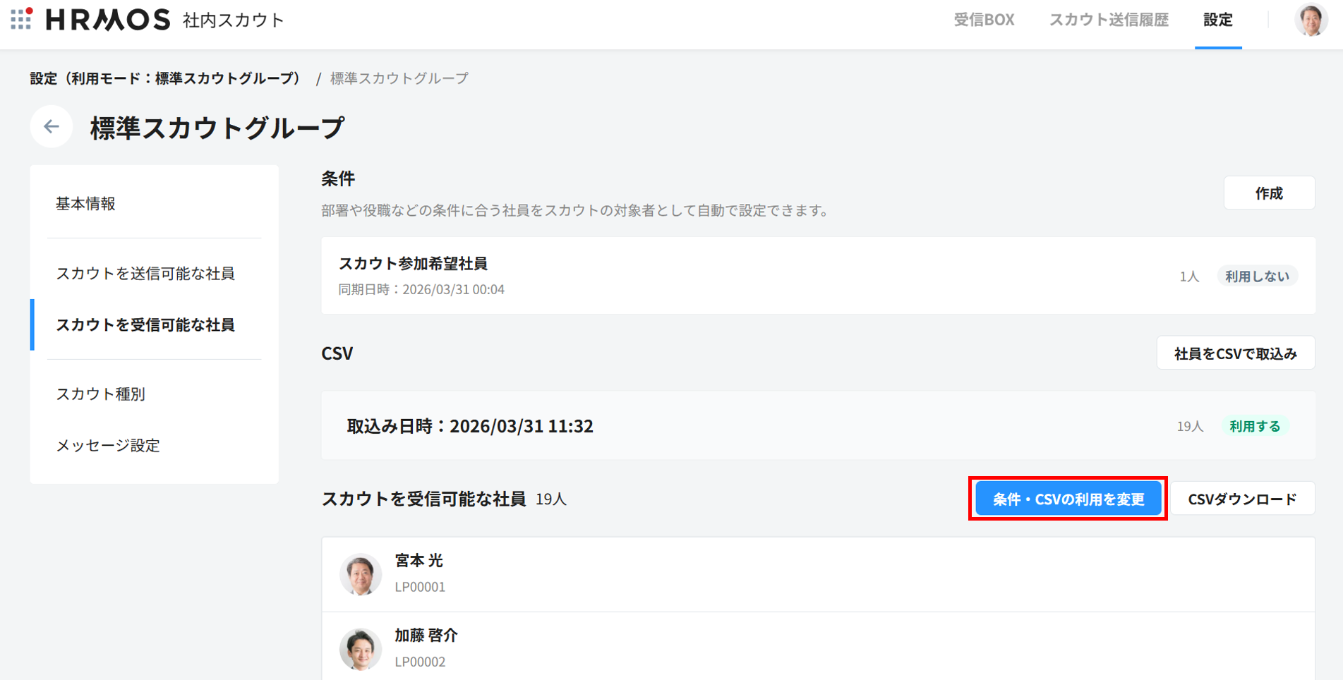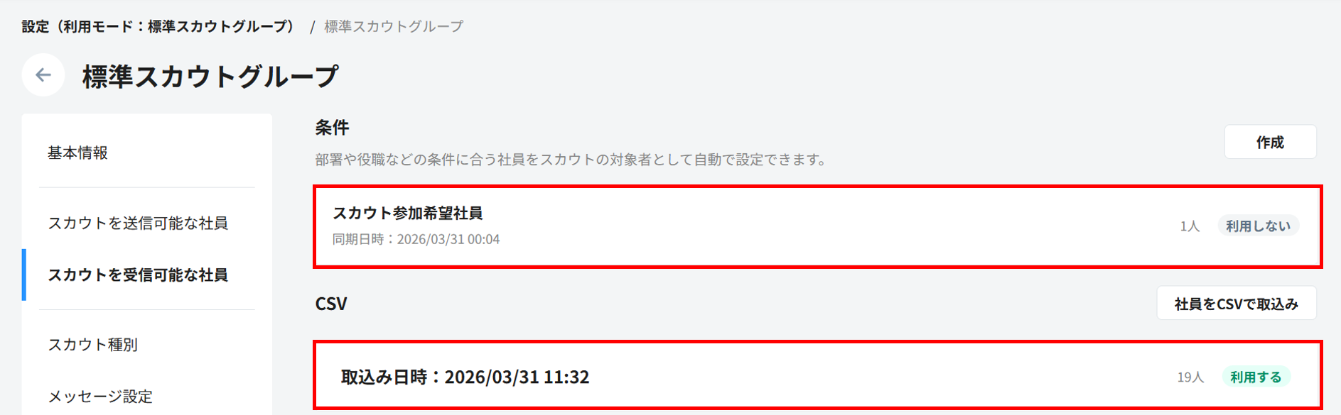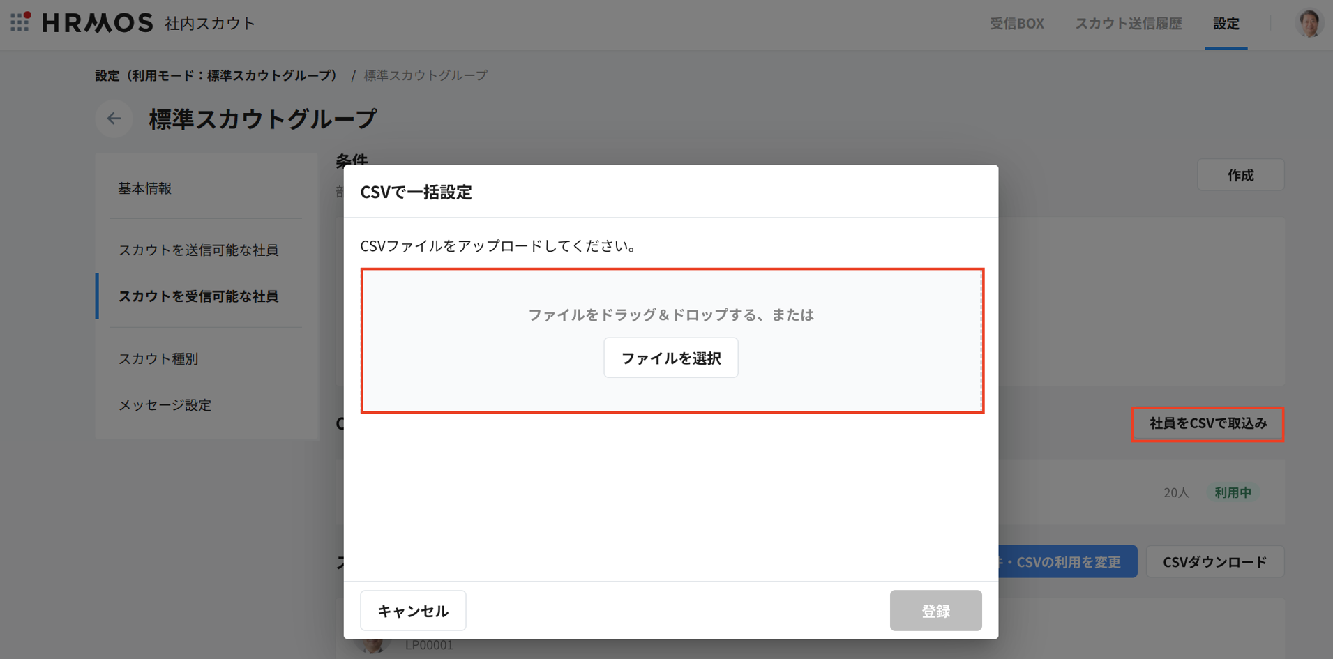 スカウトを受信可能な社員の登録方法は、CSVと条件指定の2パターンがあります。