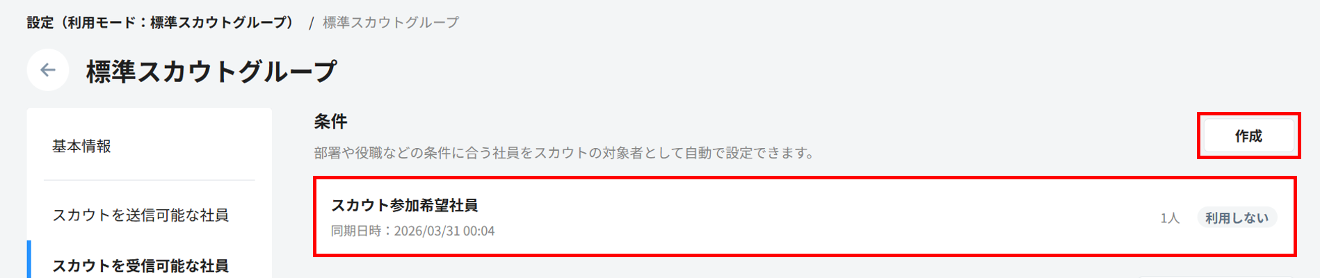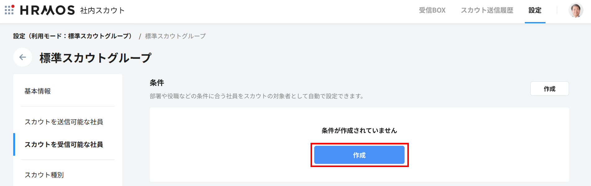 1. 「設定」 >「スカウトを受信可能な社員」> 「条件」より、作成ボタンをクリックします。