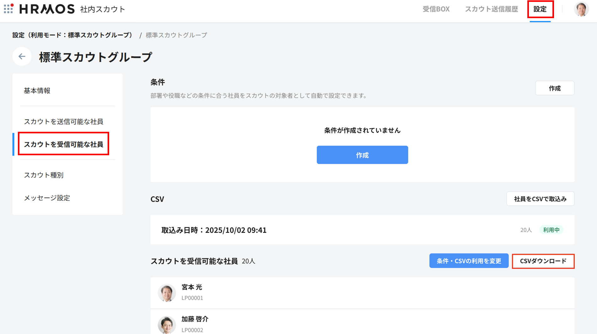 1. 「設定 >該当スカウトグループ >スカウトを受信可能な社員 > CSVダウンロード」をクリックし、CSVファイルをダウンロードします。