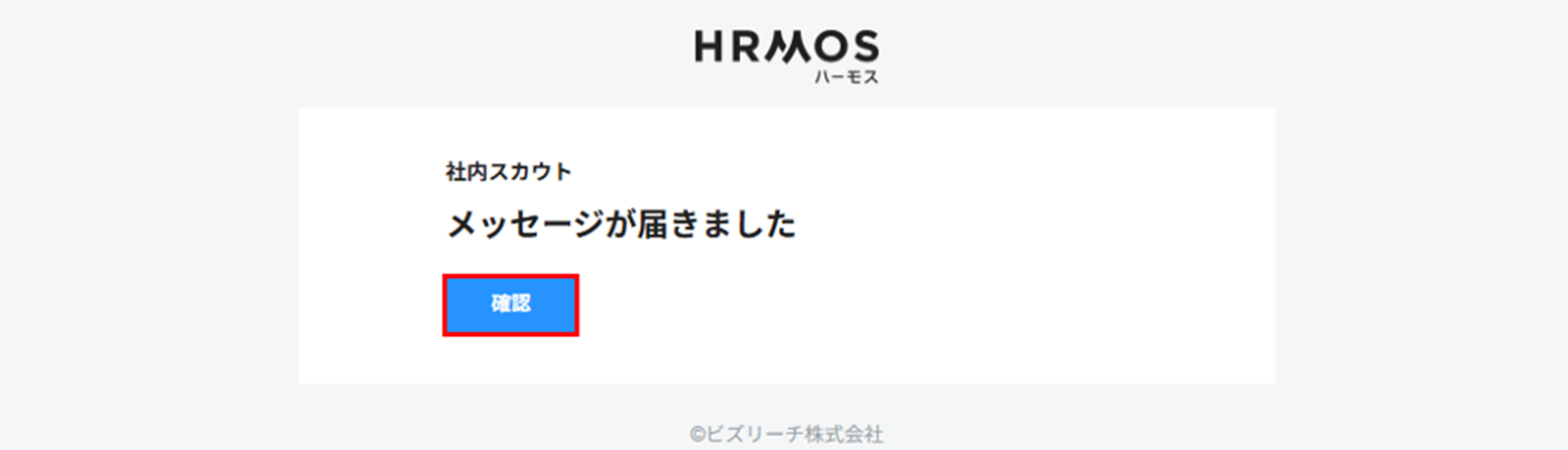 スカウトを受信した社員には、以下の内容のメール通知が届きます。「確認」をクリックすると、受信BOXに遷移し、内容を確認することができます。 ※メール通知が届かないように設定することはできません。