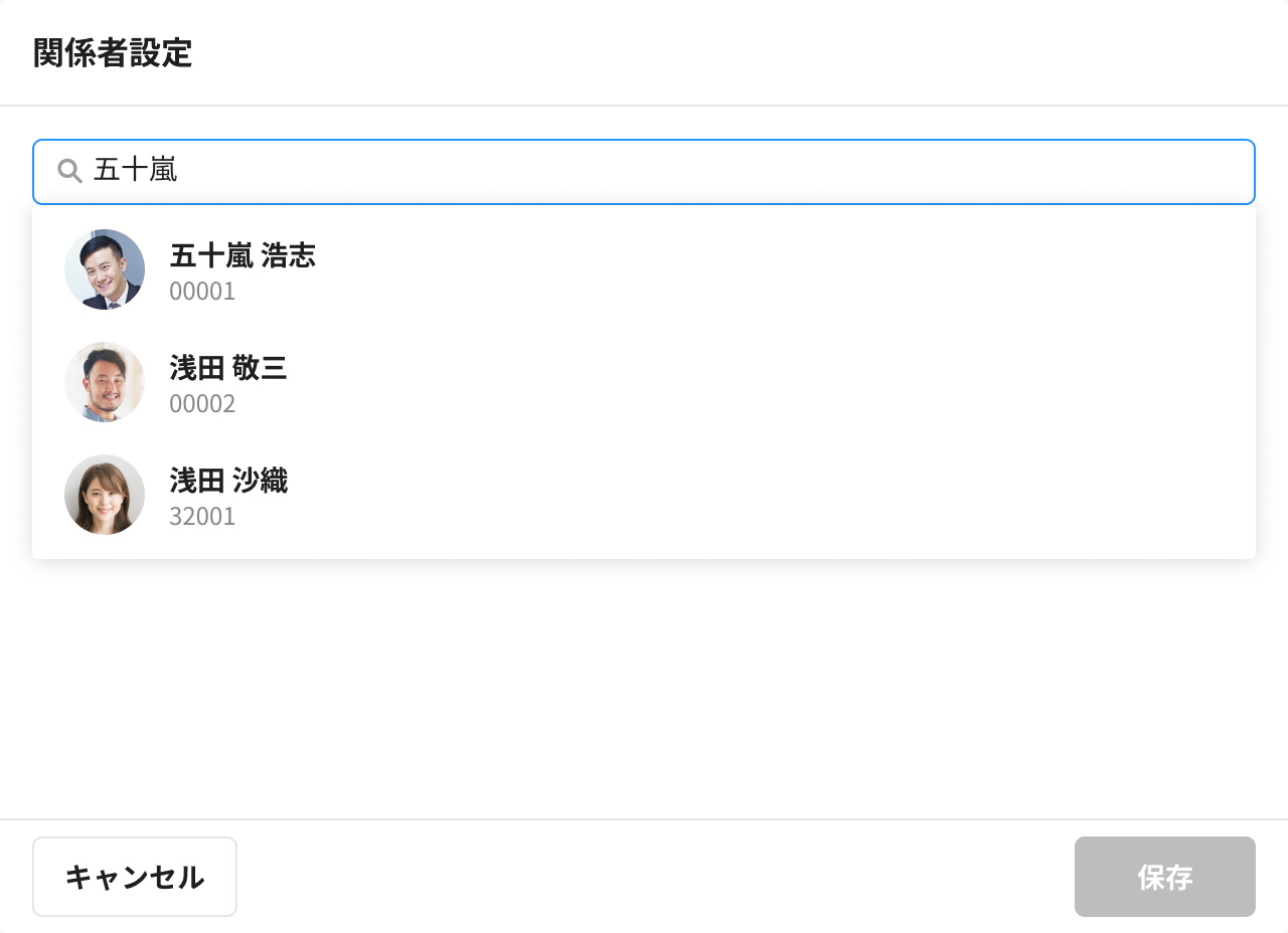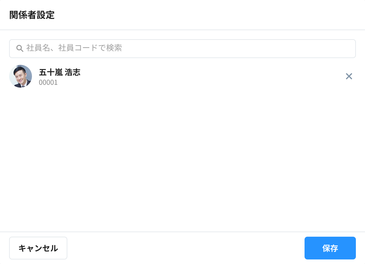 関係者に設定したい社員を、社員名や社員コードで検索します。