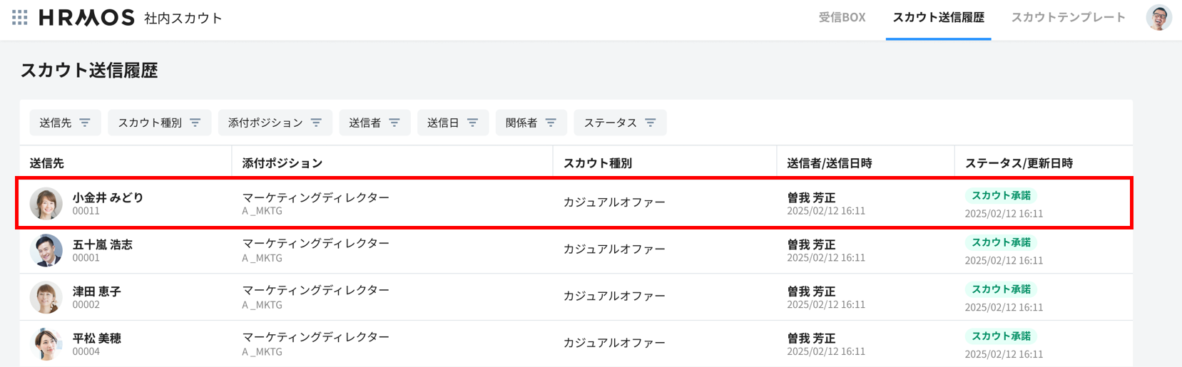 スカウトを送信された社員の情報を確認することができます。