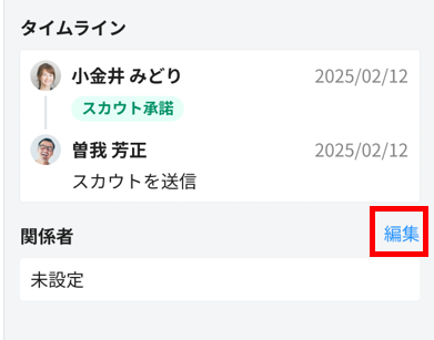 関係者として設定された社員は、スカウトのステータス変更や、関係者の変更をすることができます。