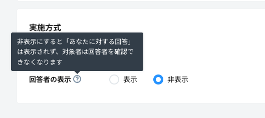 - 管理画面 > 該当の360°フィードバック> 実施方式において、「回答者の表示」を表示 or 非表示に設定する。