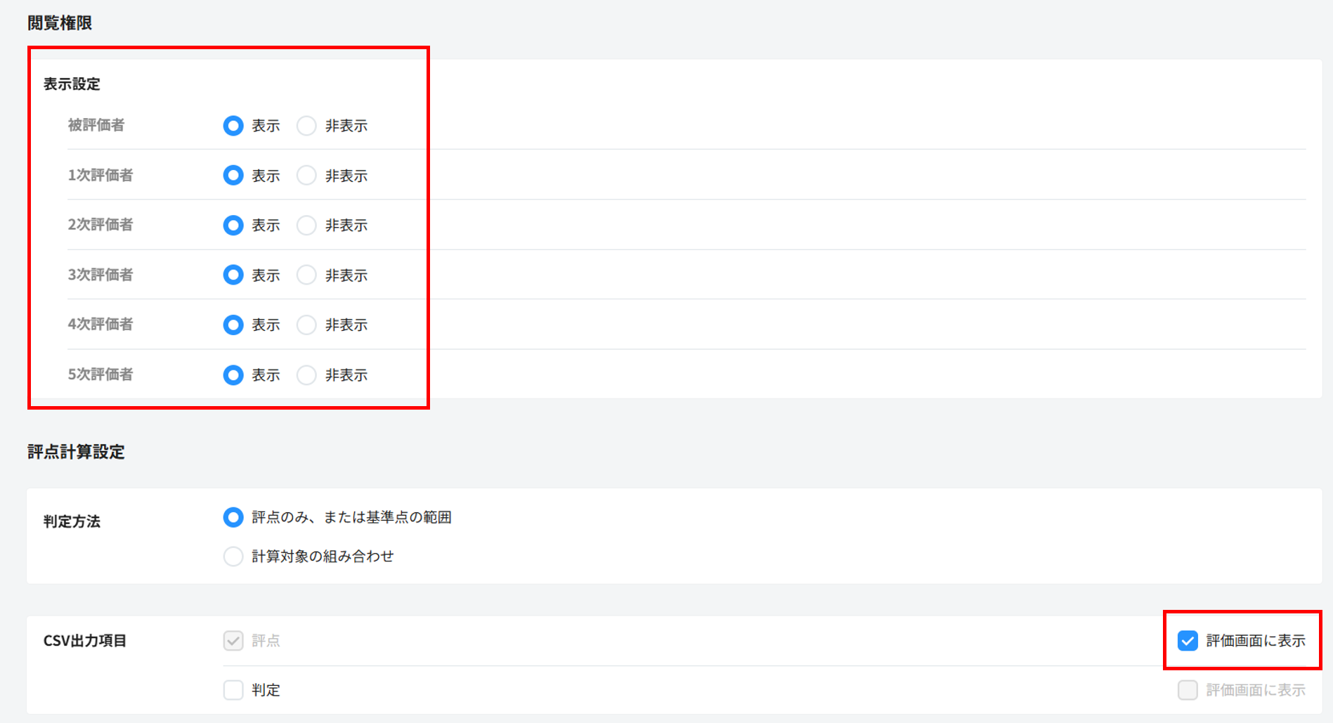 ※デフォルトでは、すべての項目の「表示」にチェックが入っています。評価が表示されない対象の次数(または被評価者)に対し、評点計算型セクションの「表示設定」にチェックがついているか、ご確認ください。