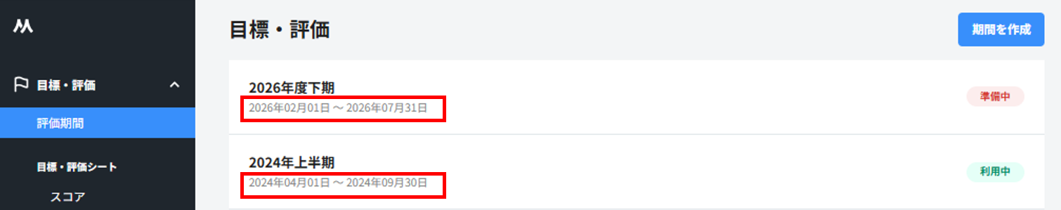 管理者権限をお持ちの方にて、HRMOS目標・評価>管理画面>評価期間の一覧より、現在日を含む評価期間が存在することをご確認ください。
