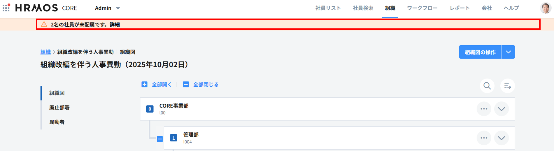 1.HRMOS CORE上で、該当社員が未配属である