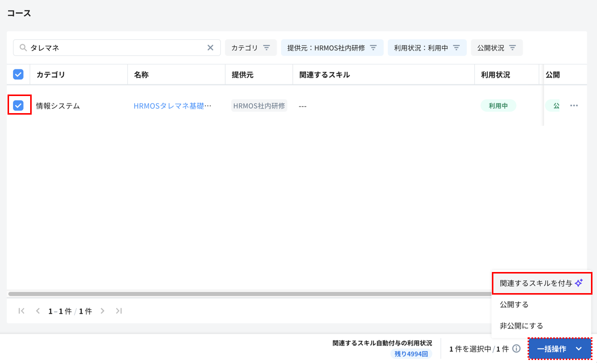 ・本機能は、関連するスキルが一つも付与されてないコースに対して付与を行うため、既に関連するスキルが付与されてるコースは、付与する対象のコースから除外されます。
