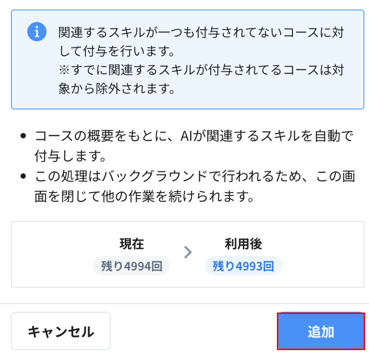 「追加」をクリックすると、AIがコースの概要をもとに関連するスキルを自動で付与します。