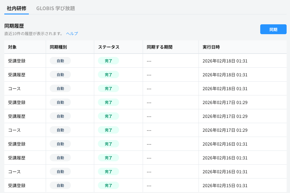 - HRMOS ラーニング > 管理画面 > 設定 > データ同期 > 社内研修から同期実行の履歴を確認可能です。