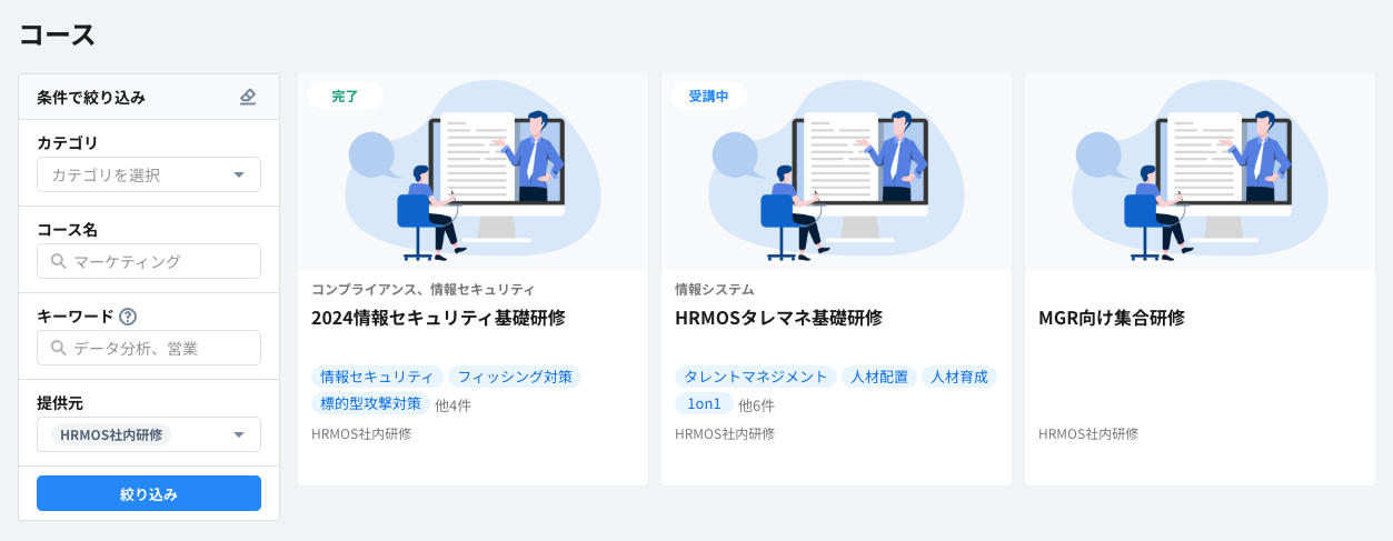 社員は、HRMOS ラーニングに連携されている社内外の学習コースの一覧を確認できます。