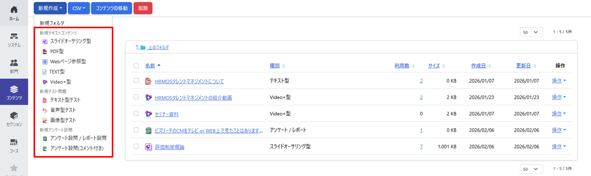 [新規作成]ボタンから、作成したいコンテンツの種別を選びます。