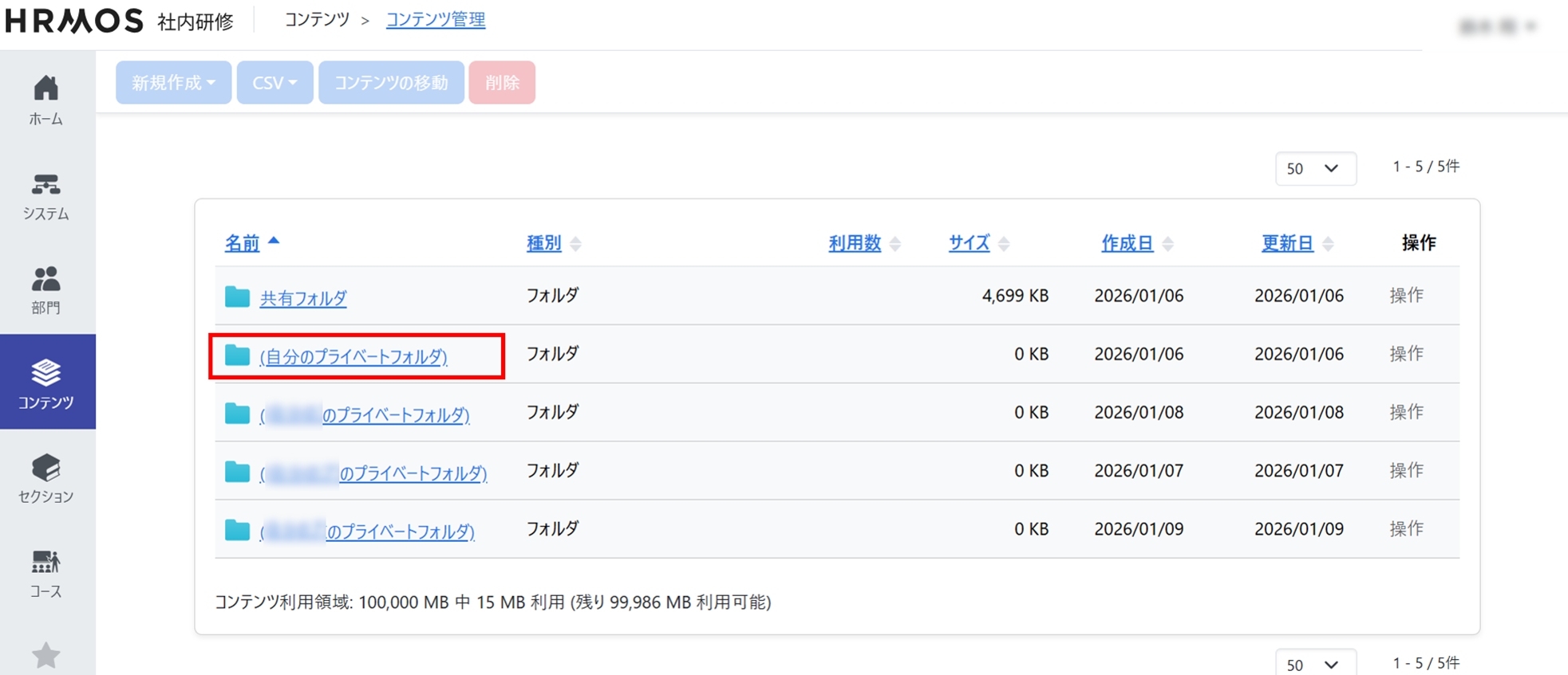 HRMOS社内研修では、学習の最小単位となる「コンテンツ(教材)」を作成し、それらを組み合わせて「セクション」を構築します。
