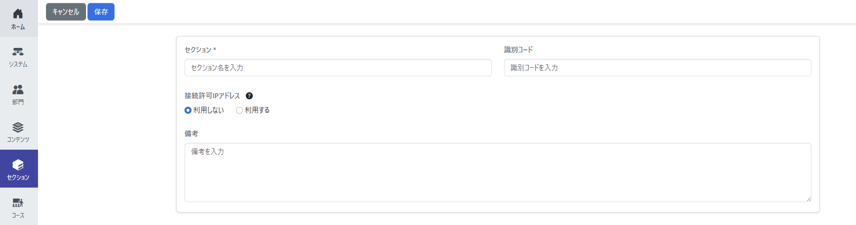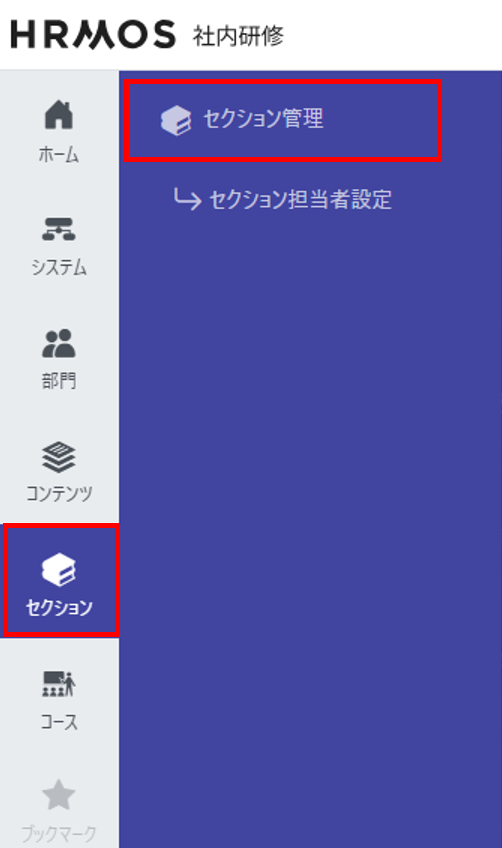 セクションメニューの[セクション管理]から[新規作成]をクリックし、セクション名などを登録します。
