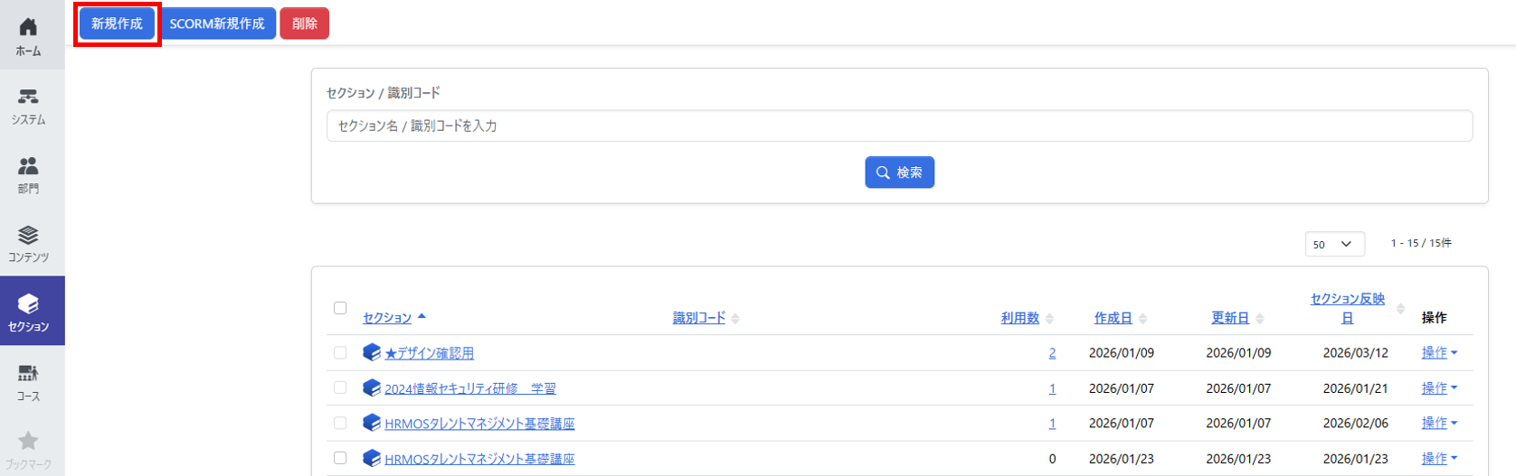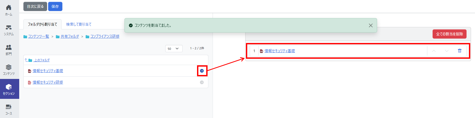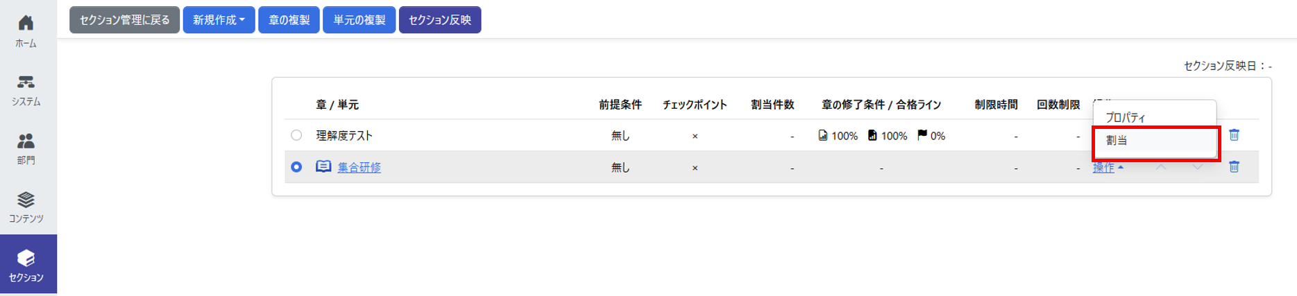 2.「コンテンツ(教材)」を組み合わせて「セクション」を構築する