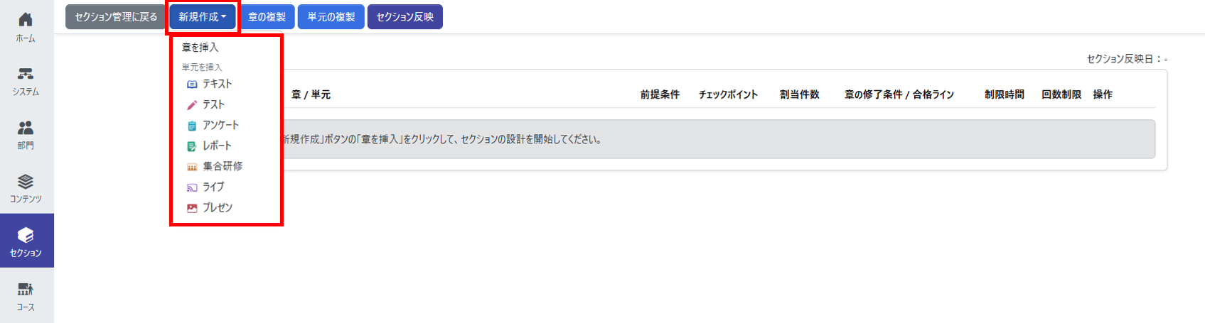 セクションは、作成したコンテンツを「章」と「単元」に分けて体系的にまとめた、一つの学習コースです。