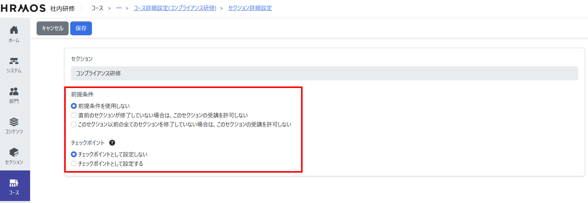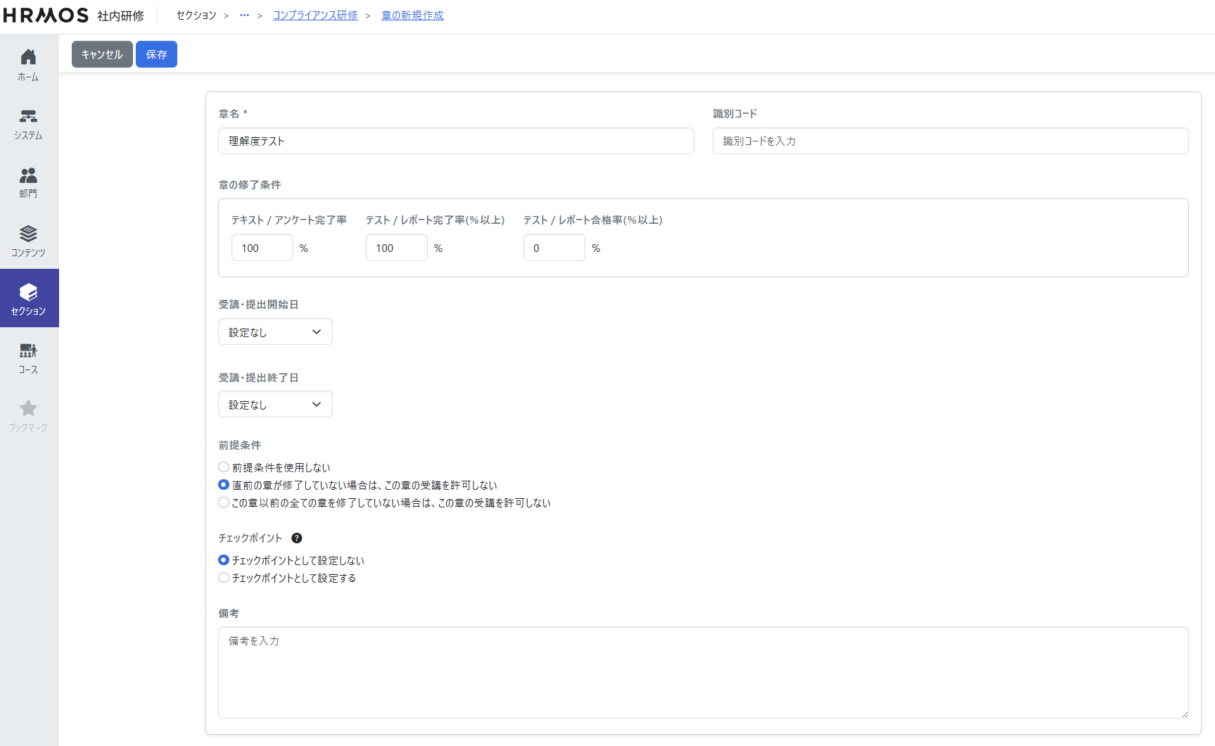 追加したセクションに対して、コースの修了条件やチェックポイントなどを設定して保存します。これで受講者にコースを提供する準備が完了します。