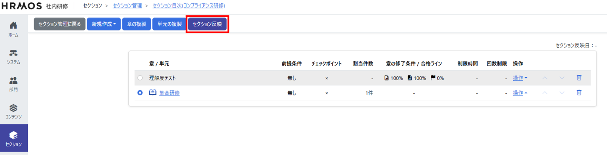 設定が完了したら[セクション反映]を実行し、作成したセクションの内容をシステムに適用します。