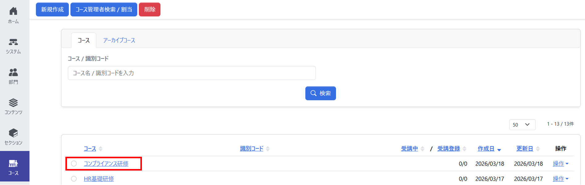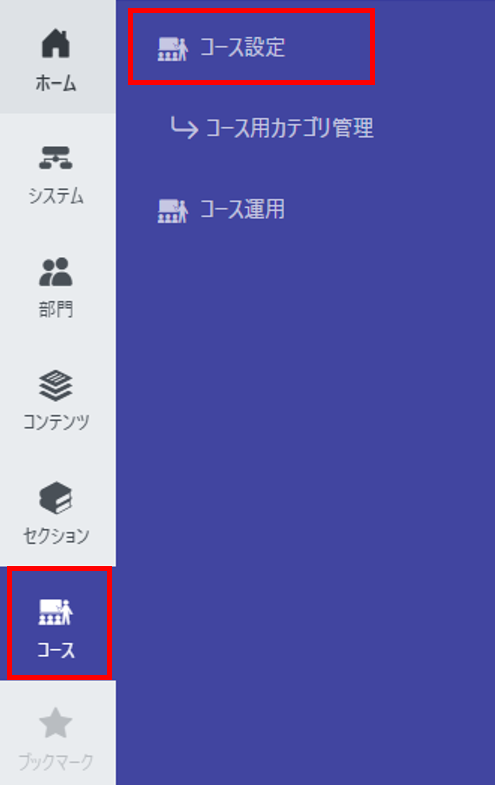 コースメニューの[コース設定]から[新規作成]をクリックし、コース名などの基本情報を登録します。