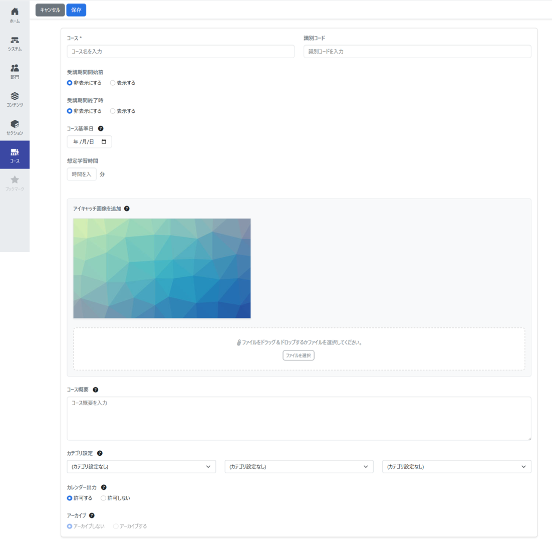 | 基本設定 | コースの名称、識別コード、受講期間前・終了時の表示有無、アイキャッチ画像などを設定します。 |
