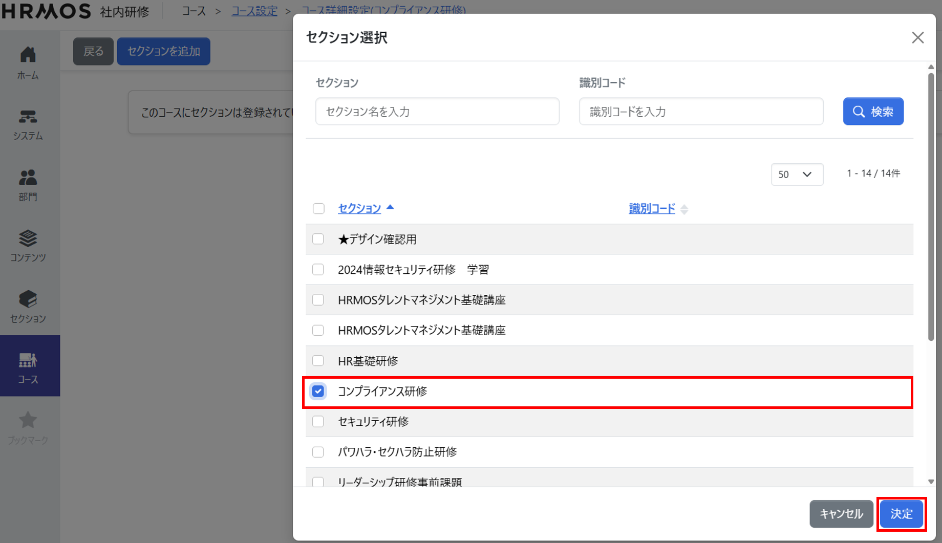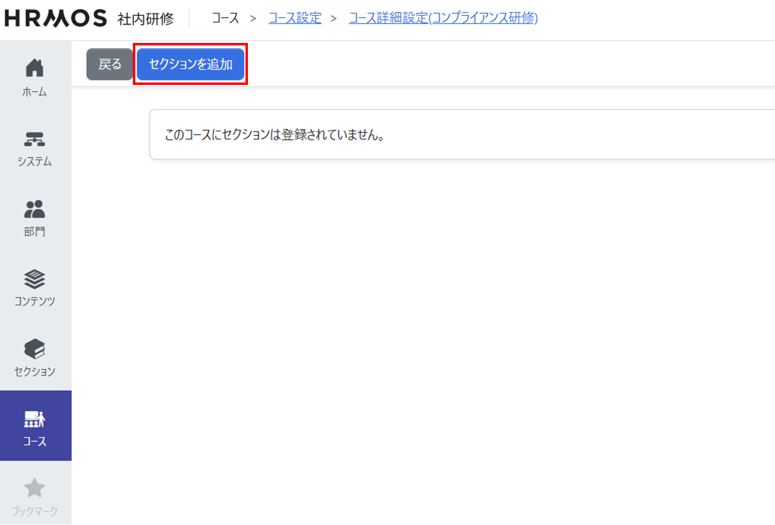 [コース設定]画面から対象コースのコース名をクリックし、[コース詳細設定]画面で[セクションを追加]をクリックして、受講させるセクションを登録します。