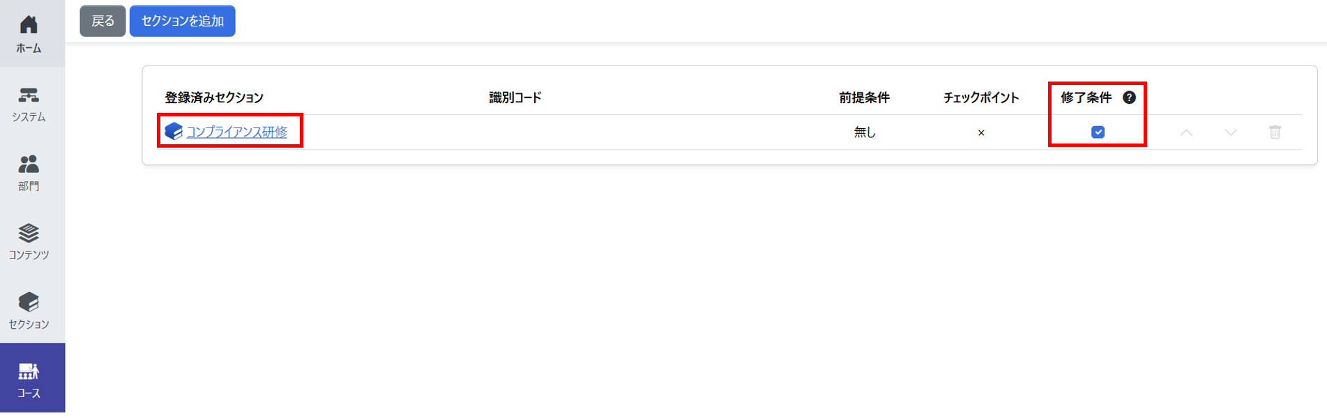 | セクションの追加 | コース内で受講させる「セクション」を選択して追加し、セクションごとの前提条件(前のセクションを修了しないと進めない等)や、コースの修了条件を設定します。 |