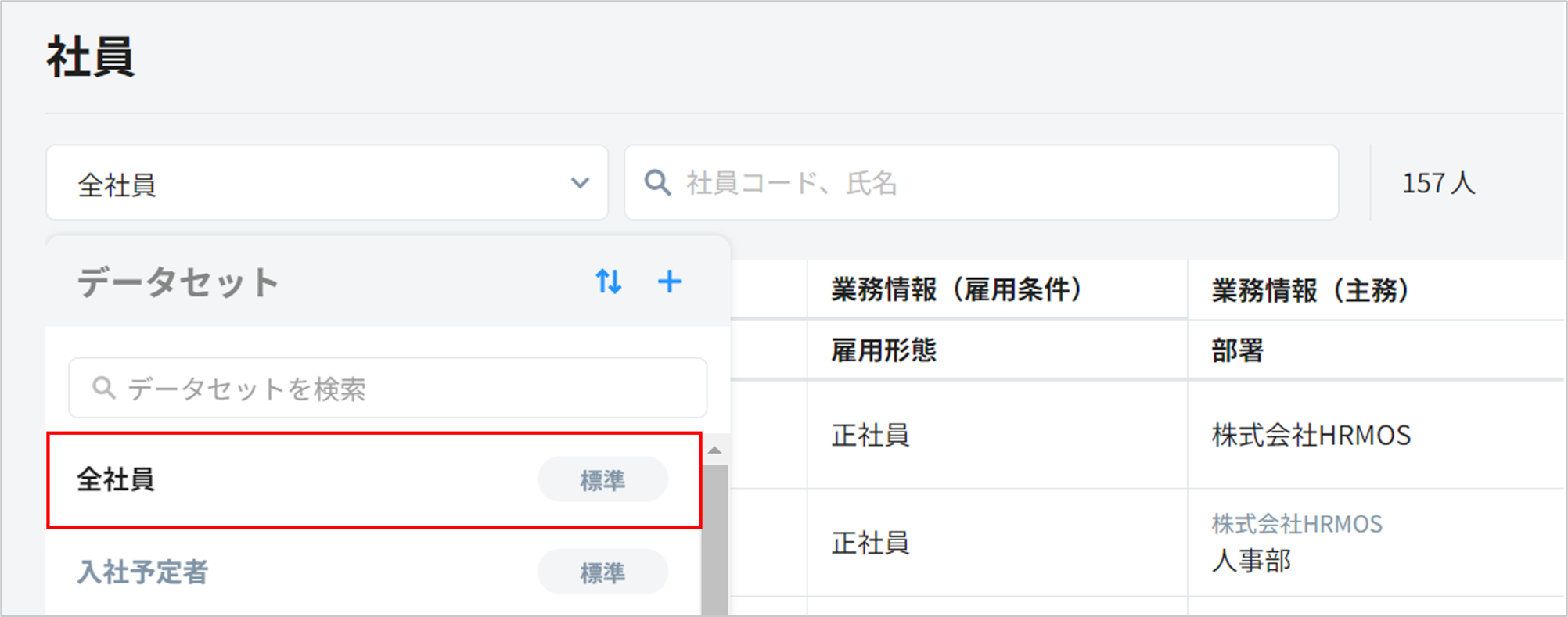 データセットが「全社員」と選択されているかをご確認ください。「全社員」以外が選択されている場合、指定した条件に合致する社員のみが表示されている状態です。