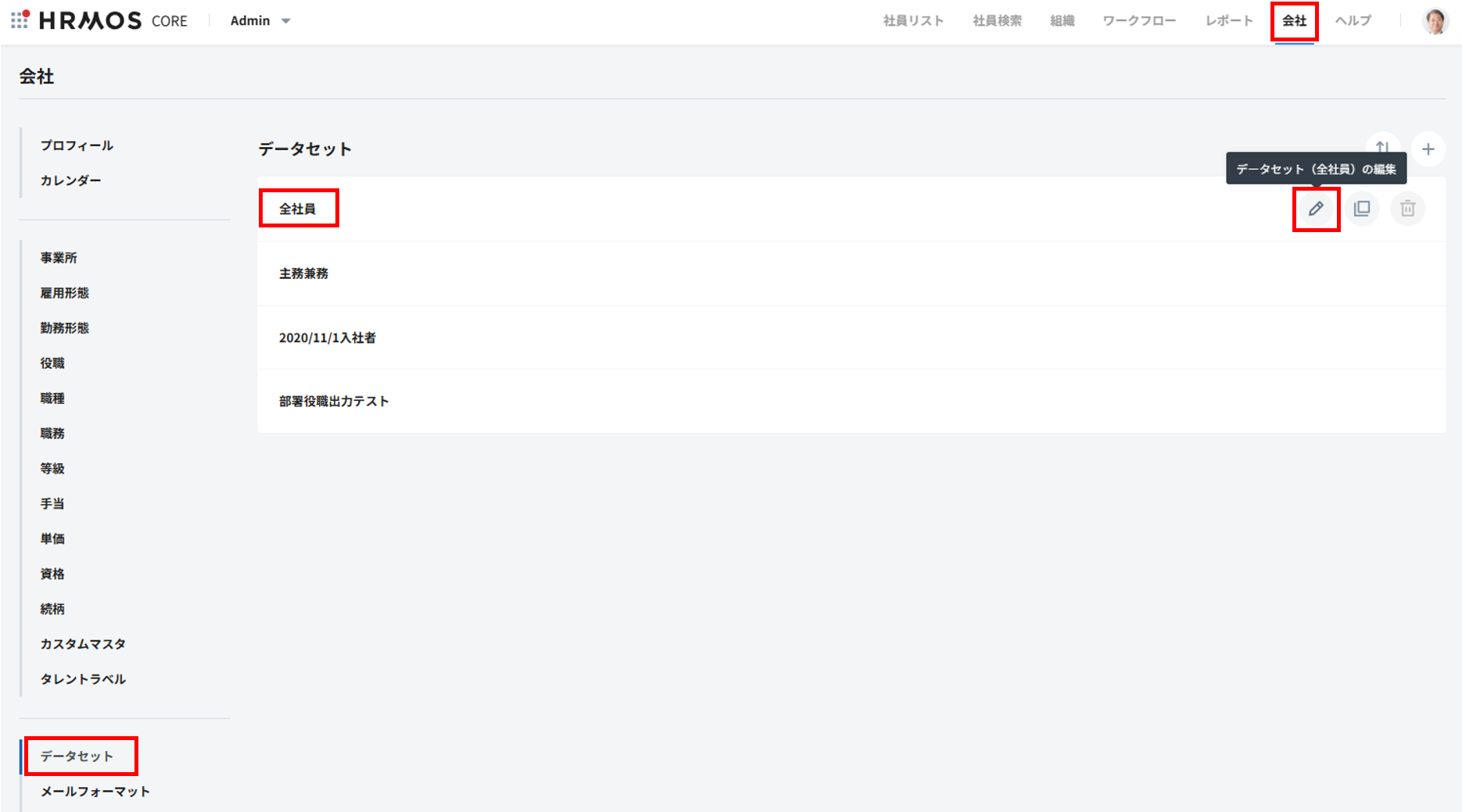 また、「会社」タブ > データセット >「全社員」の を選択し、絞り込みの条件が設定されていないかも併せてご確認ください。データセット「全社員」に絞り込みの条件が設定されている場合は、すべてクリアをお願いいたします。