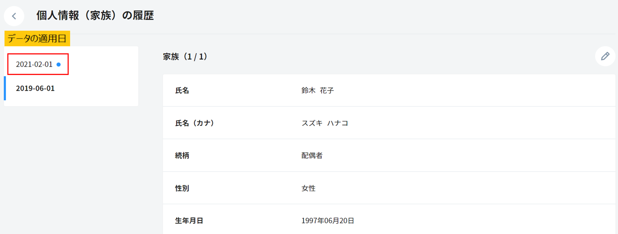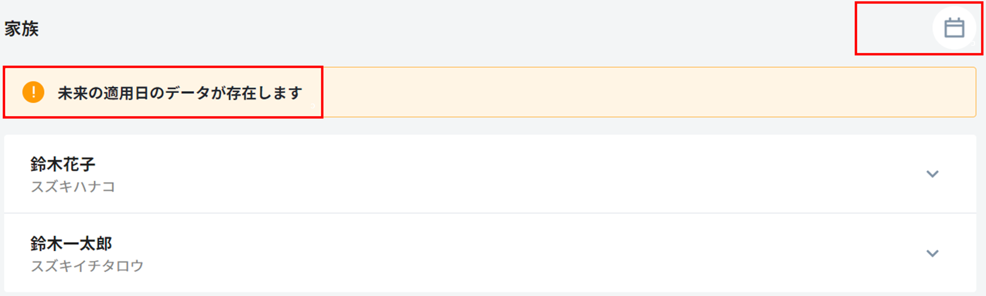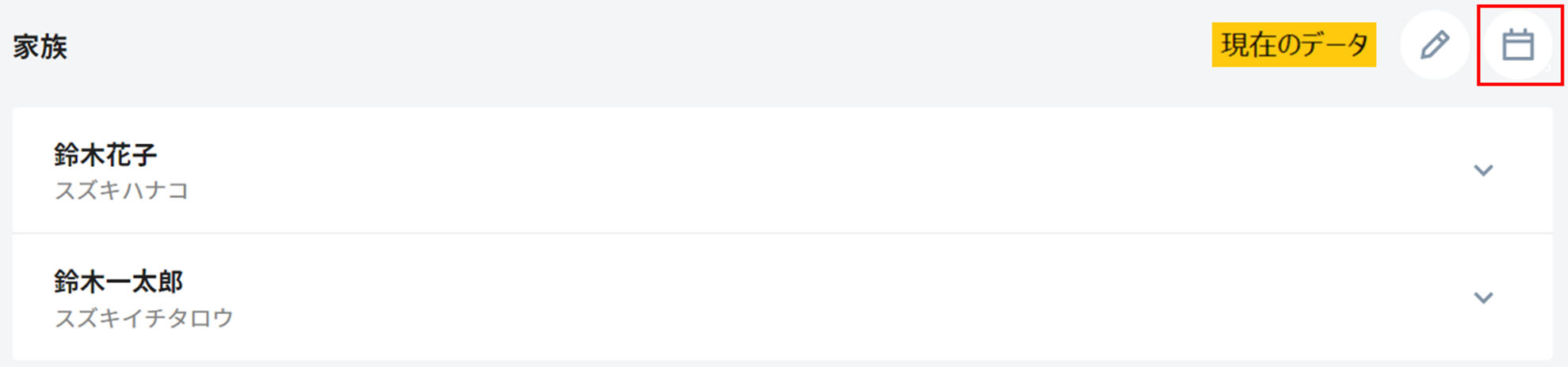 2. セクション右上の「カレンダー」をクリックすると家族情報の履歴画面が表示され、「適用日」ごとのデータのスナップショットが確認できます。