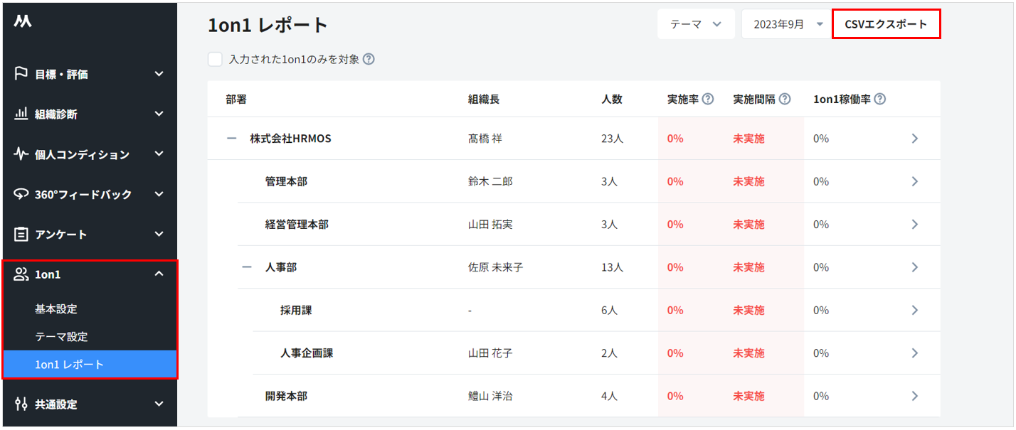 管理画面の「1on1 レポート」をCSVでエクスポートすることができます。