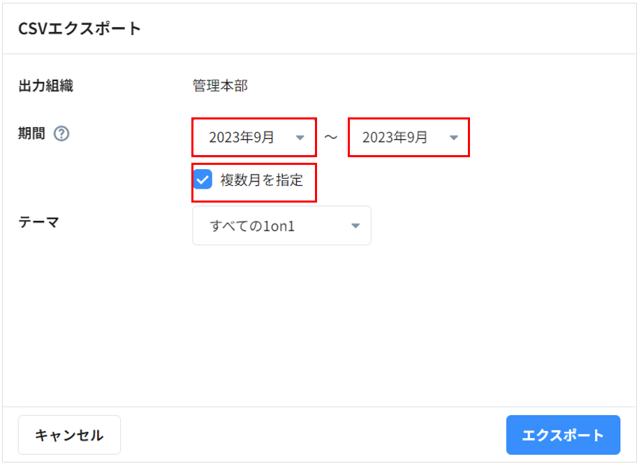 2. 「CSVエクスポート」をクリックすると、「複数月を指定」にチェックが入った状態で表示され、[yyyy年mm月]~[yyyy年mm月]のプルダウンで複数月の選択ができます。