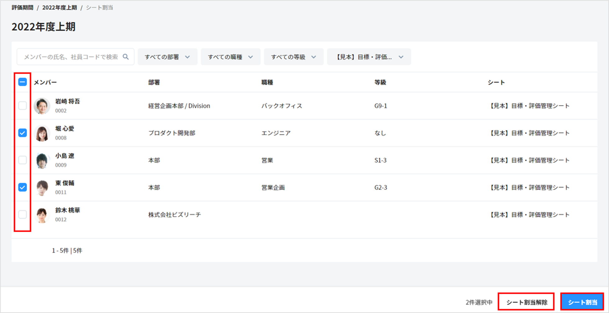 5. シートが割り当てられているメンバー一覧が表示されます。状況に応じて、該当者にチェックを入れ、「シート割当解除」または「シートの再割当」を実行してください。